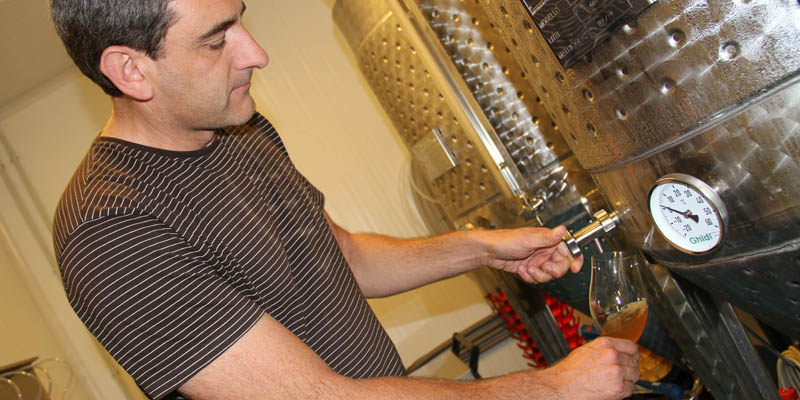 El mosto es enviado ahora al fermentador a través de un sistema de intercambio de calor que hace descender su temperatura desde unos 80 grados a 20. “En el fermentador es donde hacemos la adición de la levadura”. Otro punto muy importante para la receta es el control de la temperatura durante el proceso de fermentación. “Si queremos una receta estable que se pueda repetir en condiciones, hay que mantener la temperatura constante durante los días que dura la fermentación, en torno a veinte grados según cada receta”, explica Oscar. Cuando termina esa primera fermentación, Vulturis le añade el toque alcarreño a su producto, con un poco de miel, “un dulzor que no es predominante”.