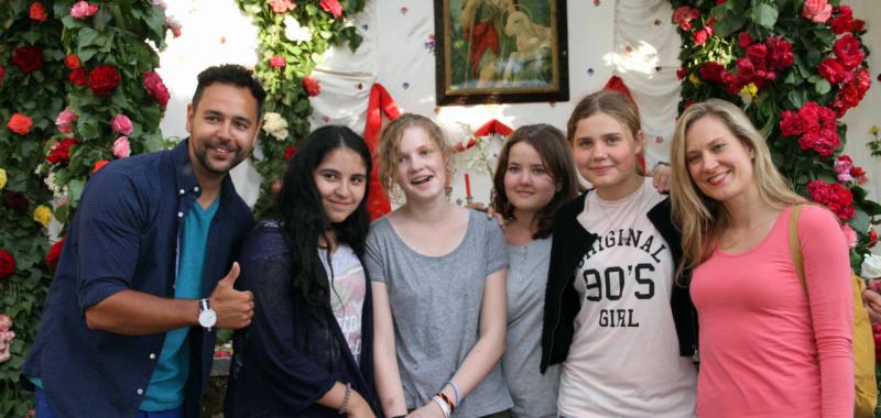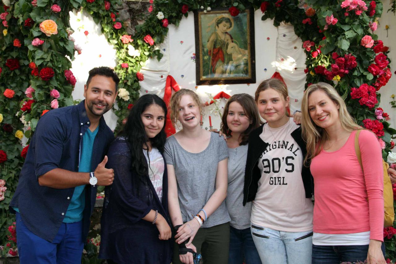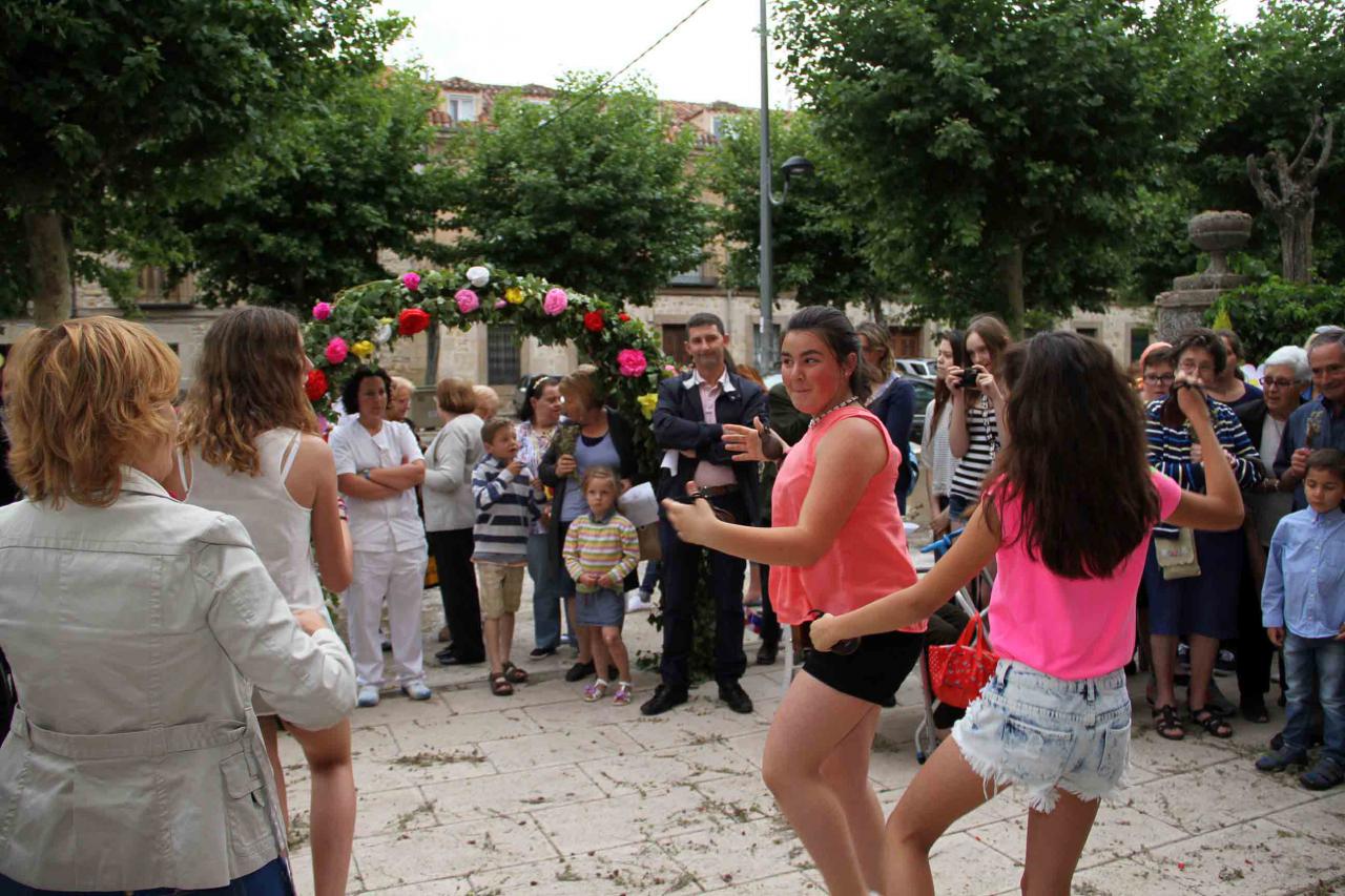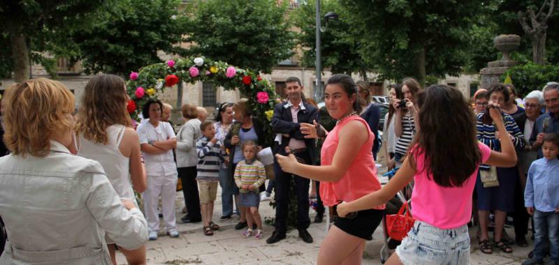Y de San Vicente a San Juan. Naturalmente, el barrio que recibe su nombre del Santo, no podía faltar al concurso. Y es que todos los vecinos, desde que recuerdan, han visto el arco colocado en la escalinata que la recoleta Plaza de San Juan tiene en uno de sus lados. Hasta allí se llega subiendo o bajando por las calles de San Juan o de Jesús. El lugar olía a cantueso y las losas de piedra del suelo, estaban alfombradas de pétalos de rosa. Esperando al jurado estaban algunas de sus vecinas, vestidas de Sanjuaneras. En cuanto sonó la dulzaina, se arrancaron a bailar. Y, pese a que el arco siempre está en el mismo sitio, nunca es igual. “Se buscan las flores y los chopos, pero luego cada año le añadimos algo original y distinto”, explicaba una de las vecinas, Teresa López. Debajo del cuadro de San Juan, propiedad de Teresa Plaza, había un fajín rojo, flores silvestres y decenas de rosas. Allí se unieron a la marcha del jurado un grupo de berlineses, que estudian español estos días en la ciudad del Doncel. Ya no se separaron de él hasta el final de la ronda.