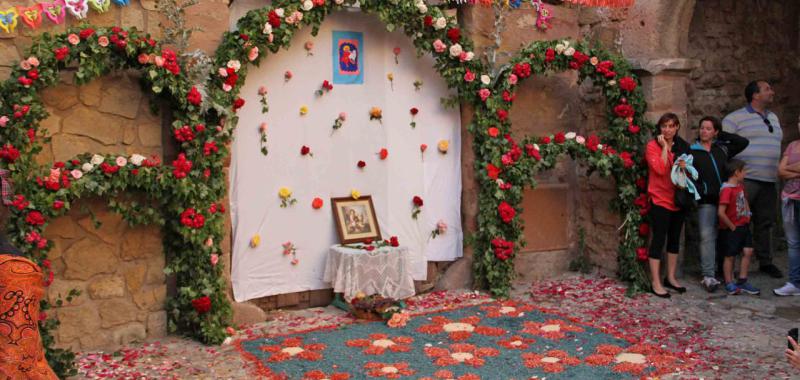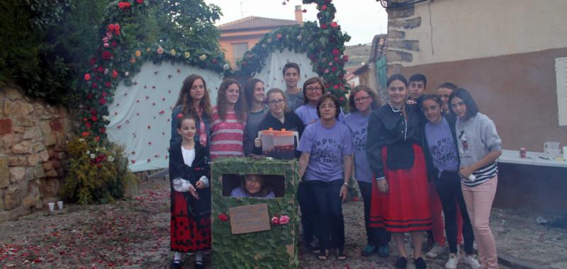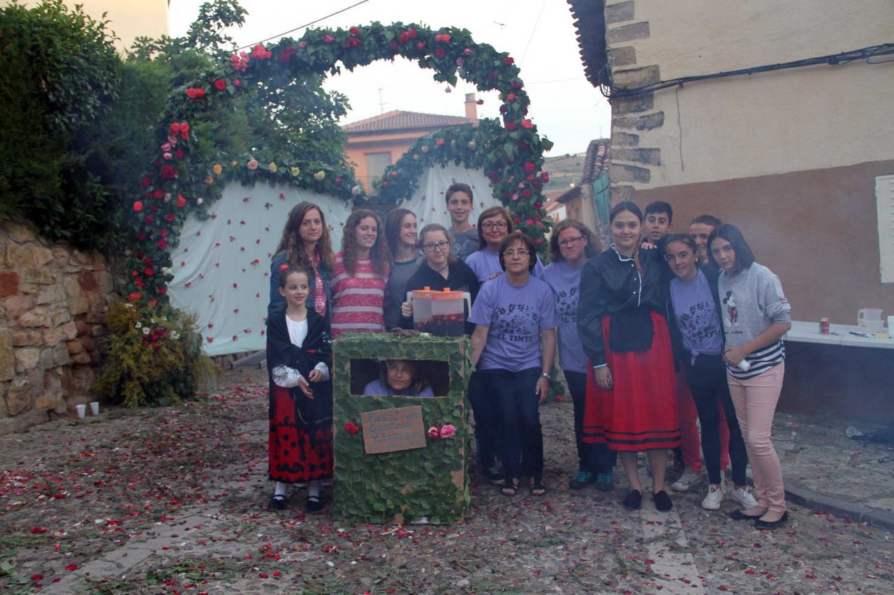 El último arco visitado por el jurado fue el del barrio del Tinte. El día 23 se cumplieron sesenta años consecutivos en los que el barrio lo teje en el mismo lugar. Todos comen y cenan allí mismo, junto al arco, y se encargan de recopilar “ramas de chopo, rosas y cardos que robamos con nocturnidad y alevosía”, decía con guasa ayer Rita Rodríguez. Con ellos recubren y adornan el armazón metálico que lo soporta. Además, El Tinte se distingue por hacer una lumbre en la que queman el tomillo y el cantueso para hacer buen olor cuando llega el jurado y los dulzaineros, y por la originalidad de los escudos que dibujan sobre el suelo, siempre con pétalos de rosas. La de este año representaba la paloma de la paz.