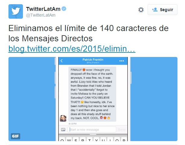“A pesar de que Twitter es principalmente una experiencia pública, los mensajes directos te permiten tener conversaciones privadas acerca de memes, noticias, movimientos y acontecimientos que se viven en Twitter. Cada uno de los cientos de millones de tuits que se envían cada día es una oportunidad para comenzar una conversación acerca de lo que está sucediendo en el mundo”, señalaba la compañía a través de su blog corporativo.