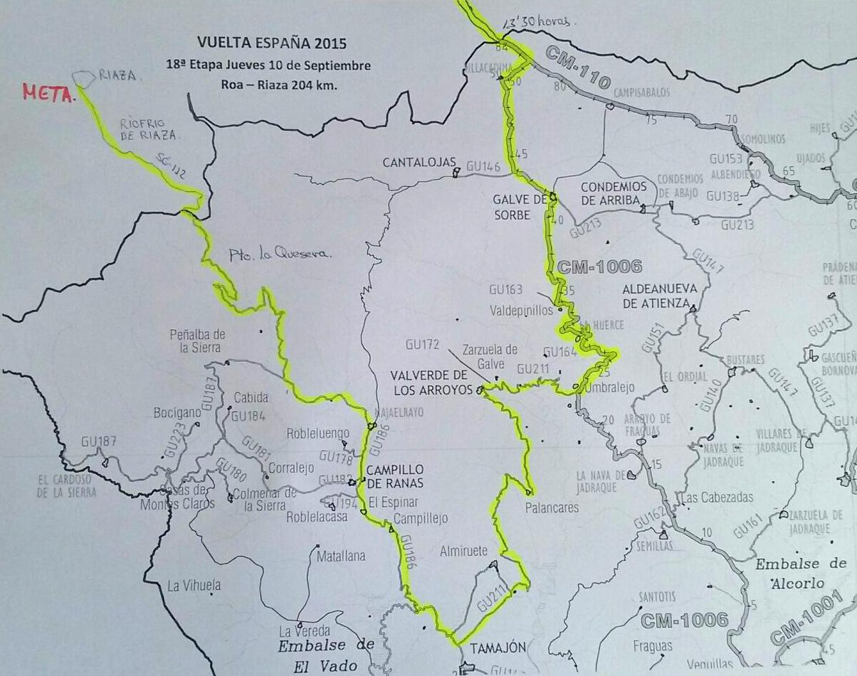 La etapa 17, que transcurre entre Roa (Burgos) y Riaza (Segovia) en un recorrido de 204 kilómetros, entrará, alrededor de las 13:30 horas en Guadalajara por la CM 110. Dos kilómetros después tomará un desvió hacia la CM 1006, en dirección Villacadima. Por esa carretera pasará por Galve de Sorbe. A la altura de Umbralejo se desviará por la GU-211 en dirección a Valverde de los Arroyos, atravesando la localidad de Valverde de los Arroyos, para entrar a continuación en el municipio de Tamajón. La carrera cruzará Palancares y rozará después las poblaciones de Almiruete y Tamajón. Los ciclistas pasarán delante de la Ermita de la Virgen de los Enebrales por la GU 186, en dirección a Majaelrayo. La carrera se desviará allí por un camino vecinal asfaltado hacia el Puerto de la Quesera y el límite provincial. La Vuelta saldrá de Guadalajara por la SG 112, continuando hasta Riaza donde está instalada la meta.