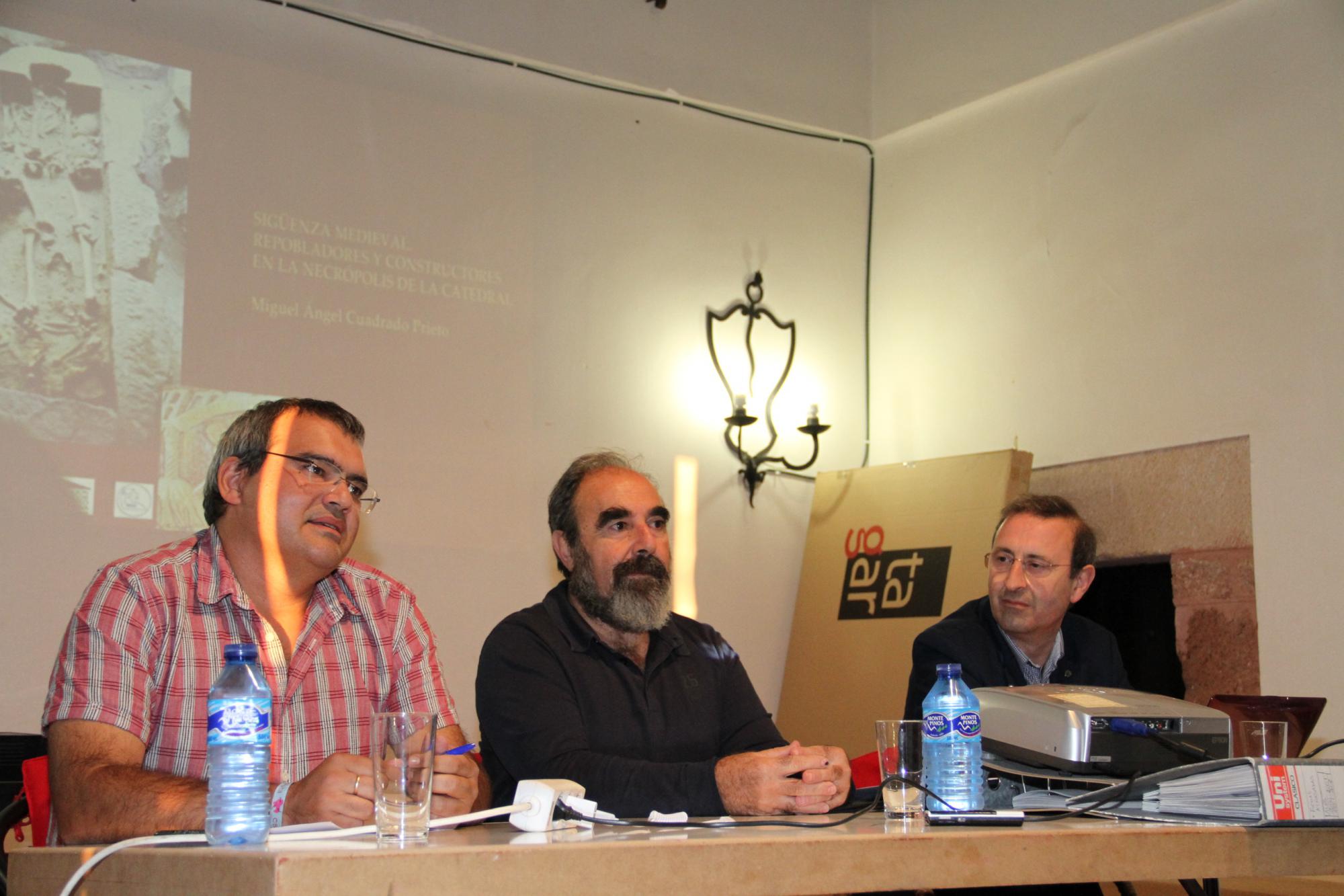Miguel Angel Cuadrado disertó sobre los últimos descubrimientos en la cripta de la Necrópolis de la Catedral y sobre la interpretación de los mismos, aportando datos sobre la cronología de las tumbas. En esta materia, su voz es probablemente la más autorizada de la provincia, puesto que fue él quien dirigió, junto a María Luz Crespo, la excavación de la muralla en la Calle Cardenal Mendoza; junto a Isabel Cardín, la excavación de la tumba de los padres del Doncel en la Catedral de Sigüenza y también de la Necrópolis medieval del patio sur.