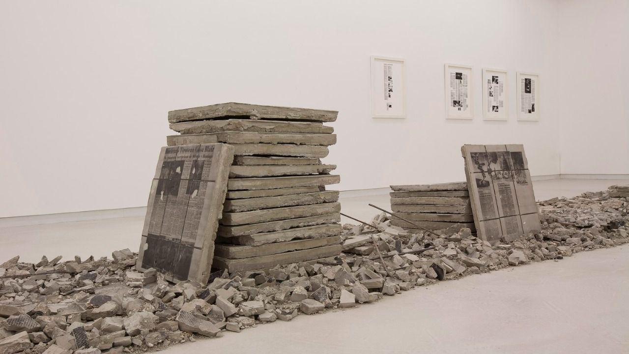 La exposición está formada por una gran instalación formada por más de cien planchas de cemento en las que el artista ha transferido textos e imágenes que tienen el objetivo de indagar sobre la “Ley Mordaza”.