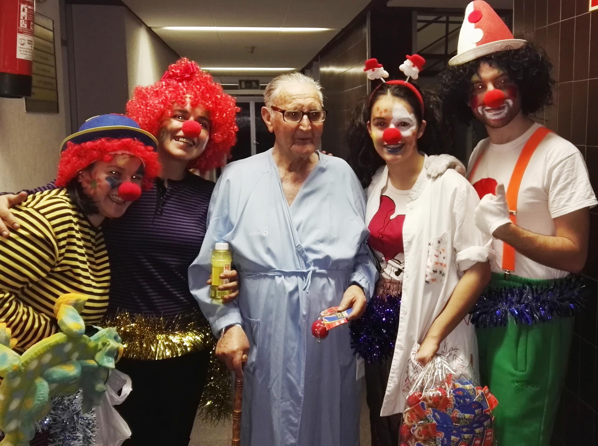 Acompañados por el director médico, Juan José Palacios, por la directora de Enfermería, Ana Hurtado, y por el supervisor de Geriatría, Iván Ramón, los payasos de Barabú entraron en las distintas habitaciones, donde conversaron con los pacientes, y dedicaron sus bromas a los profesionales de las distintas plantas, con quienes compartieron momentos entrañables pertrechados con narices rojas, repartiendo caramelos y animando a todos a ponerse una nariz de payaso.