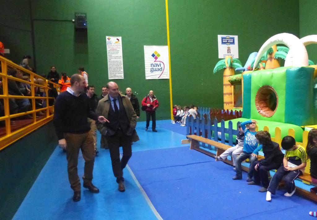 El presidente de la Diputación, José Manuel Latre, ha visitado este lunes el programa de ocio Naviguad que organiza la Institución Provincial estos días en el polideportivo San José de Guadalajara junto al diputado delegado de Juventud y Deportes, Lucas Castillo, y varios diputados provinciales. Durante la visita se ha mostrado satisfecho por “la respuesta de los ciudadanos a esta iniciativa de ocio infantil pero también solidaria”, ya que se invita a las personas que se acerquen hasta el polideportivo San José a traer un kilo de alimentos no perecederos que, después, se entregará a las organizaciones sociales para canalizar esta ayuda. Del mismo modo, ha destacado el buen balance del Naviguad celebrado en Molina de Aragón el pasado fin de semana y en Sigüenza el lunes y martes pasado: “entre Molina y Sigüenza se han recogido unos 800 kilos de alimentos y han participado unas 1.500 personas de media; unas cifras que, seguramente, se verán muy superadas con el balance de la capital que hoy finaliza y donde por el momento se calcula que han pasado ya unas 7.000 personas”.