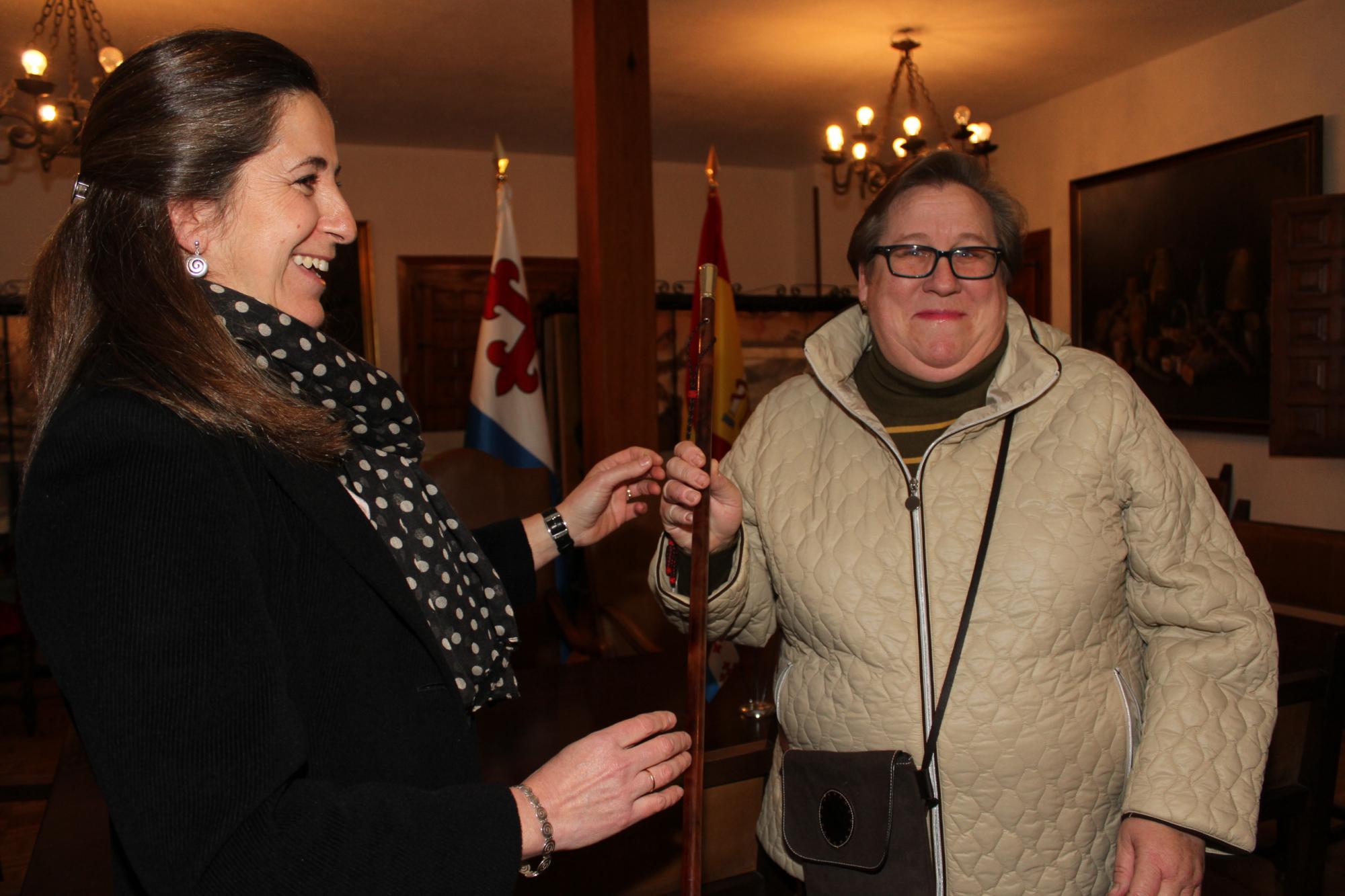 Rosa Ruiz fue elegida ayer alcaldesa de Santa Agueda por sorteo, recibiendo el bastón de mando del Ayuntamiento de manos de la teniente alcalde, Rosario Toledano