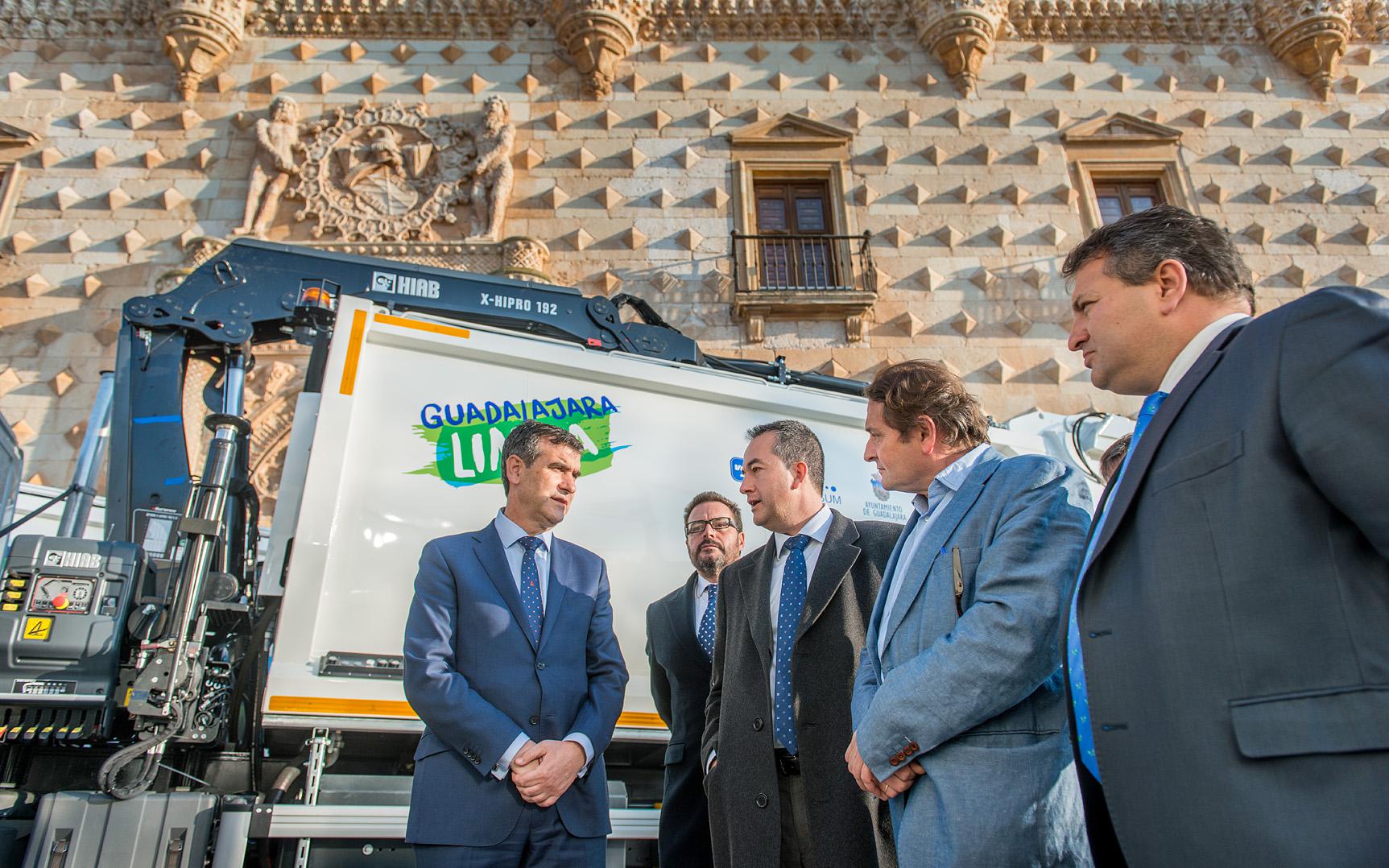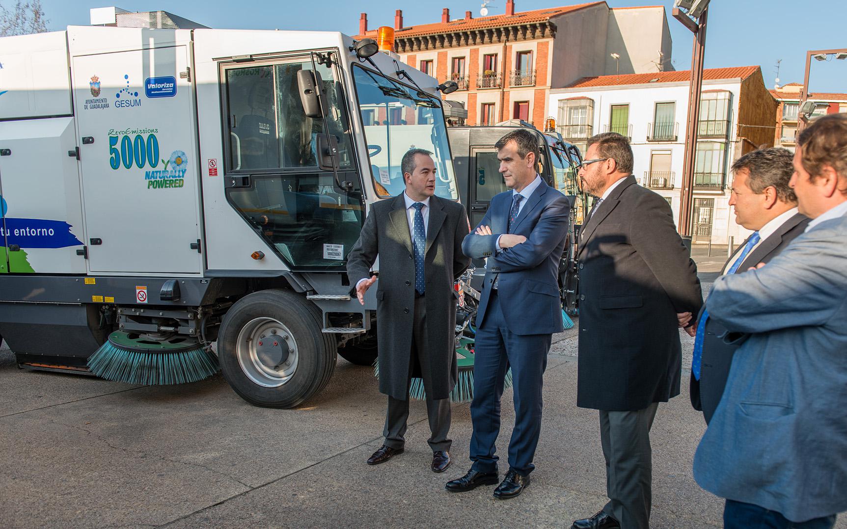El alcalde de Guadalajara, Antonio Román, ha presentado esta tarde la nueva flota de vehículos de limpieza y recogida de residuos sólidos urbanos que comenzarán a prestar servicio en la ciudad de la mano de la empresa concesionaria, Valoriza – Gesum.