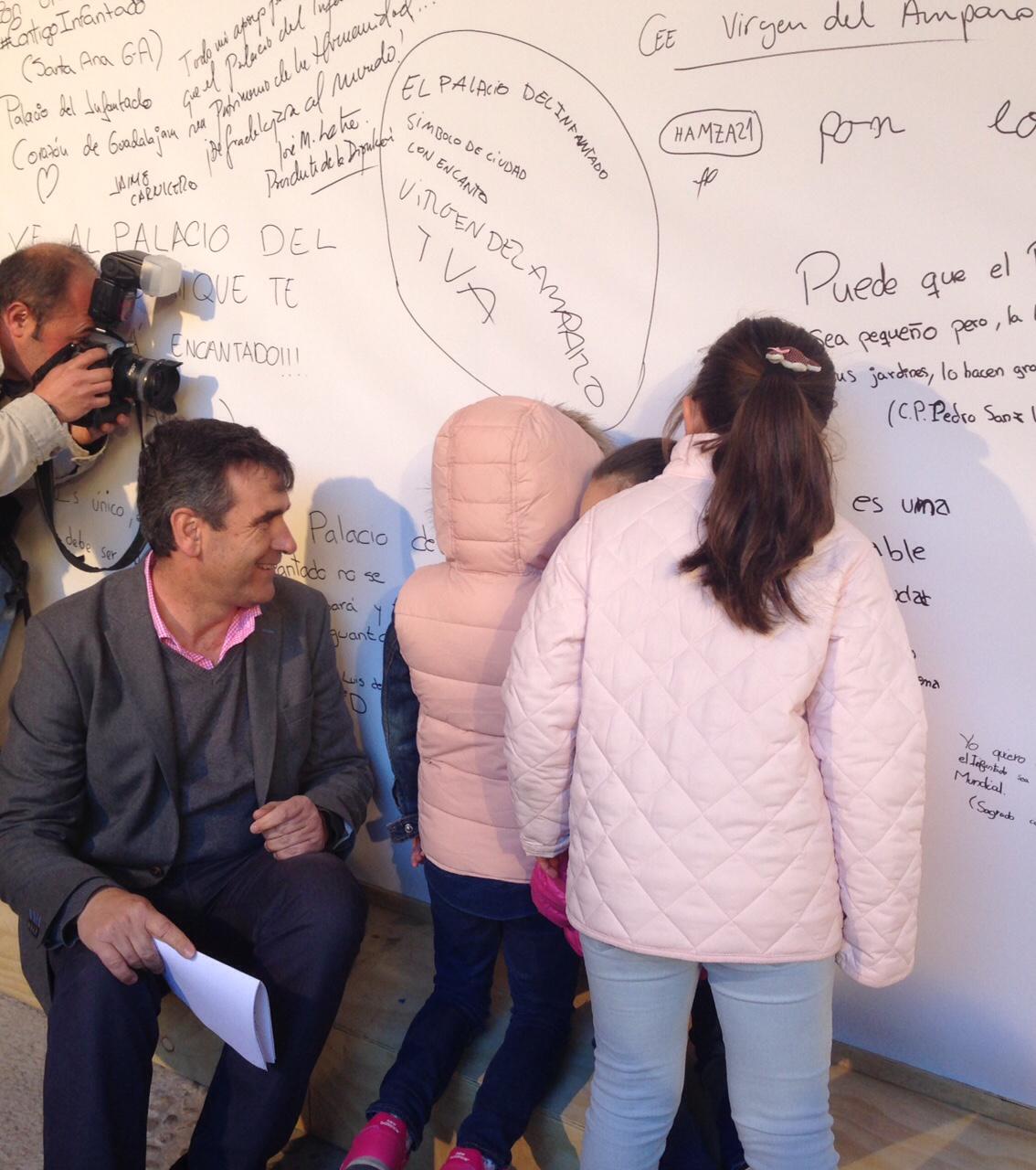 La Noche de los Sentidos ha arrancado a las 19 horas con la firma del alcalde, Antonio Román, en el mural que el Ayuntamiento de Guadalajara ha instalado en el Patio de Los Leones del Palacio del Infantado para dar la oportunidad a vecinos y visitantes de escribir un mensaje de apoyo a este monumento en su carrera a ser declarado Patrimonio Mundial de la UNESCO.