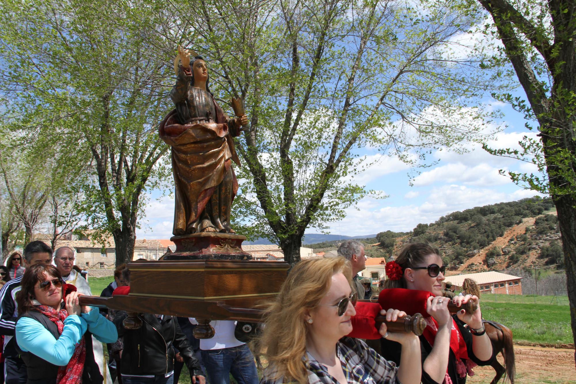 Cuando los jinetes cerraron la cabestrada en la nave del pueblo, sonaban las campanas de la Iglesia de la Asunción de Azañón. No sobraba el abrigo en una mañana fría y húmeda. Hasta la puerta del templo, que presidía una por fin soleada torre del reloj, se acercaba la charanga 'A Toca Teja', de Guadalajara. La magnífica talla, del siglo XVII, fue sacada a hombros por los fieles para, por la calle Mayor, emprender el camino precisamente de la Ermita de San Juan. Dista algo más de un kilómetro del pueblo. En la romería, los azañoneses rezaban el rosario, y cantaban, mientras se relevaban para llevar al santo a hombros.