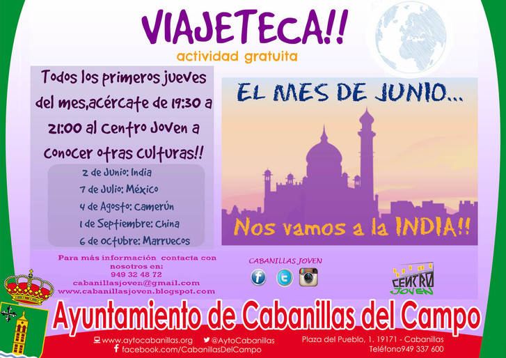 VIAJETECA.- El jueves 2 de junio se realizará la primera sesión de una actividad juvenil que se extenderá durante los primeros jueves de los meses sucesivos, hasta octubre, y que consiste en una jornada temática sobre la cultura de un país determinado. Habrá charlas y juegos relacionados con cada país en cuestión, comenzando la primera sesión (19:30 horas, Centro Joven) con la India. Las siguientes citas se centrarán en países como México (7 de julio), Camerún (4 de agosto), China (1 de septiembre) y Marruecos (6 de octubre). Esta actividad no requiere de inscripción previa, y es gratuita.