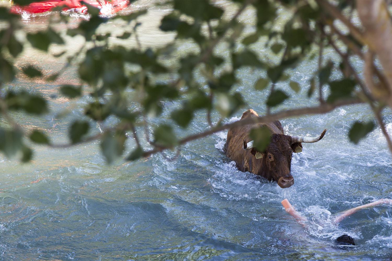 La suelta de las reses por la ribera del río a su paso por la localidad –tres procedentes de la ganadería de José María López, de Almoguera (Guadalajara), y otras tres adquiridas por la Peña Taurina al hierro de Arriazu, en Ablitas (Navarra)- ha congregado a unas 10.000 personas, según estiman fuentes de Protección Civil presentes en el acontecimiento.