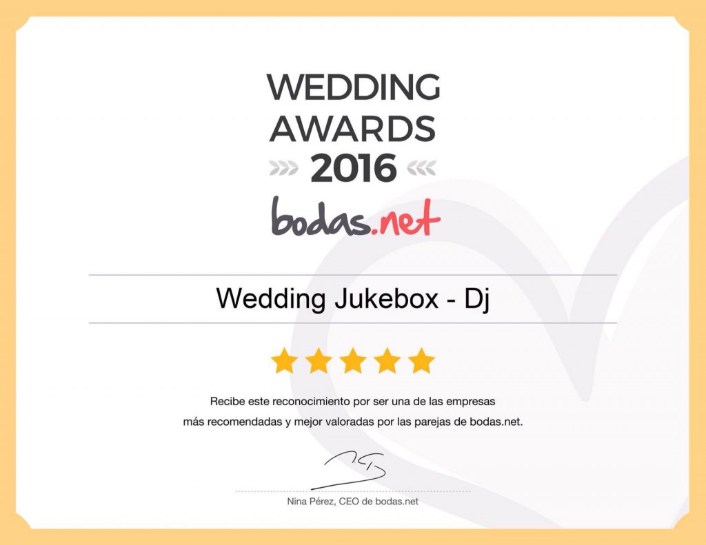 La página web bodas.net, referente nacional incontestable entre las parejas que están preparando sus enlaces, ha reconocido a la empresa de Guadalajara Wedding Jukebox en sus Wedding Awards 2016, en la categoría de Proveedor Musical.