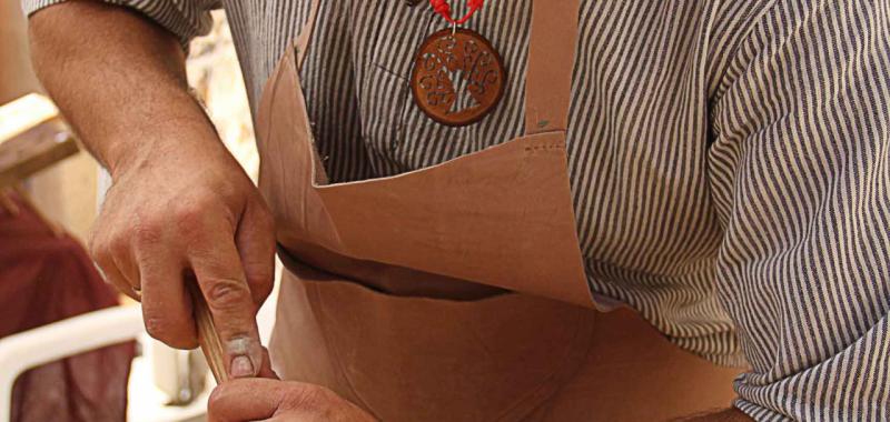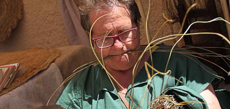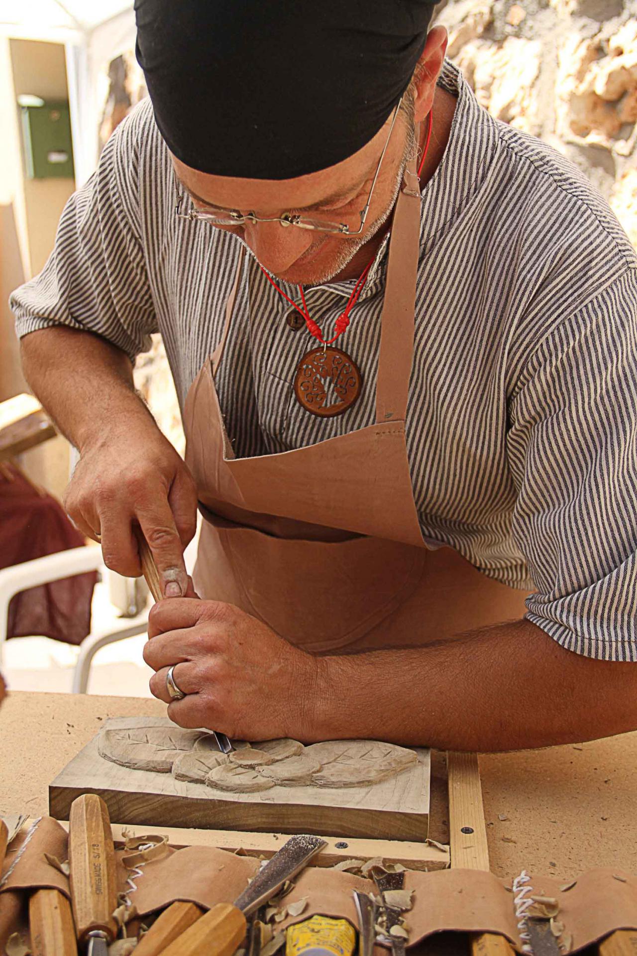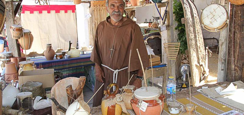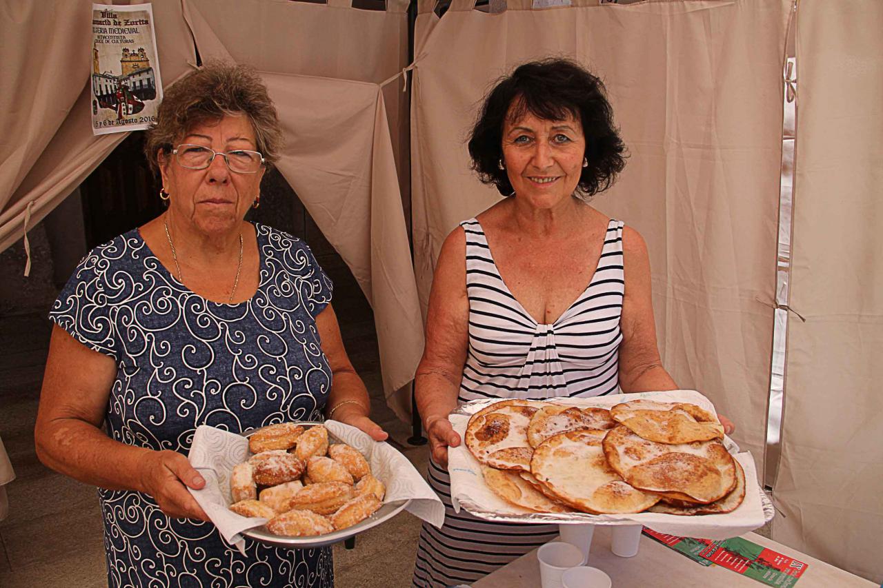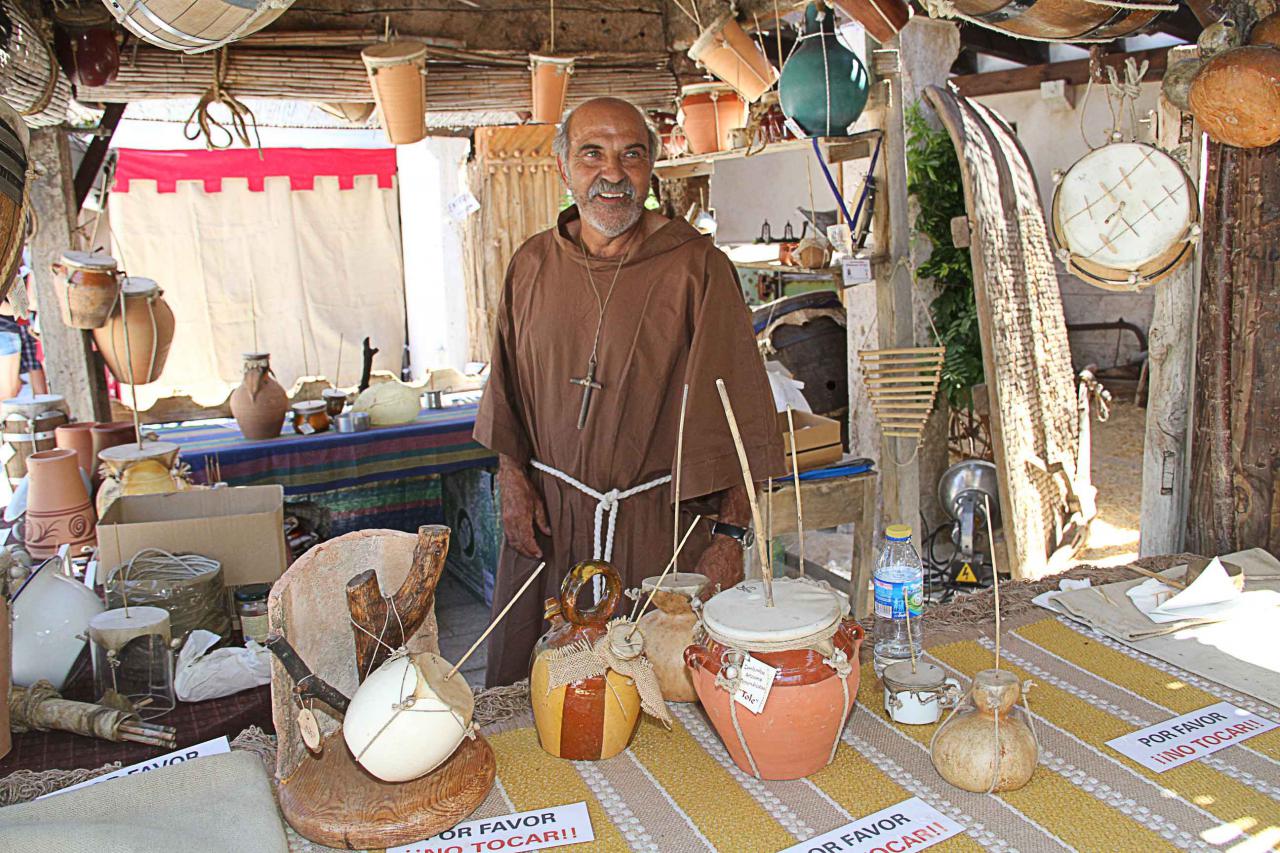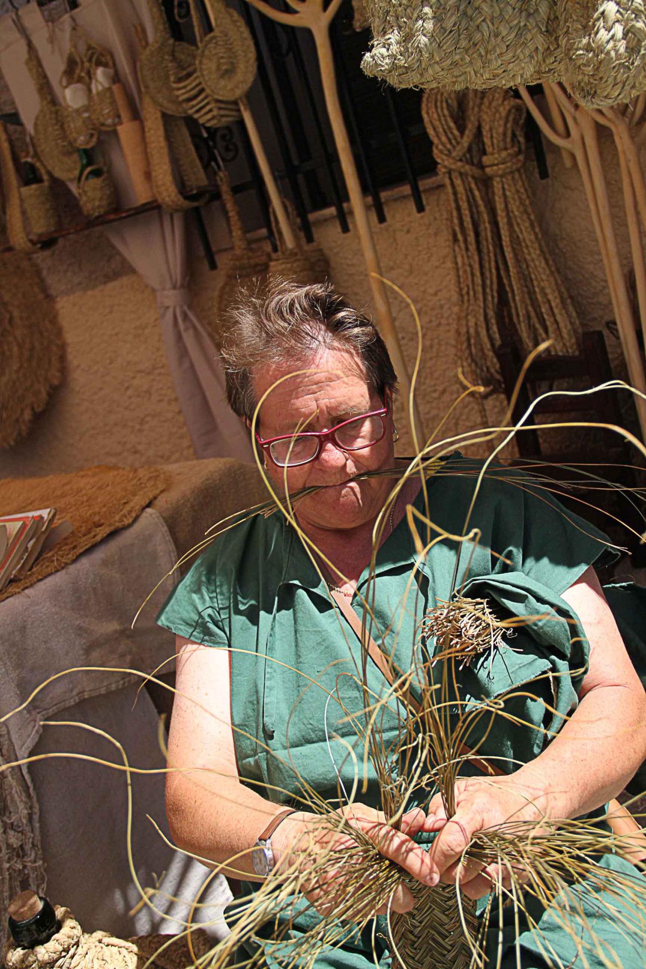 Frente a la puerta del Ayuntamiento estaba Rosa Ruiz, mostrando a todo el que se acercaba su arte con los bolillos. “Me han encargado confeccionar una liga para una novia, que se va a casar el día 10 de septiembre”, explicaba mientras se aplicaba a la tarea con sumo cuidado. A su lado estaba Carmen. En este caso, y recogiendo con ello la herencia de su padre, Pedro, mostraba su artesanía del esparto. Pronto empezará ya a recoger la materia prima en la comarca. El puesto, profúsamente decorado, acumulaba aperos de labranza, recubrimiento para garrafas y botijos, serijos para el cebo de los pescadores, cuerdas, los soplillos para la lumbre, todos elementos fundamentales en una época, como la recreada, en la que no había cartón ni plástico. Carmen trabaja el esparto virgen o machacado, en este ultimo caso, ideal para hacer alfombras y cuerdas.