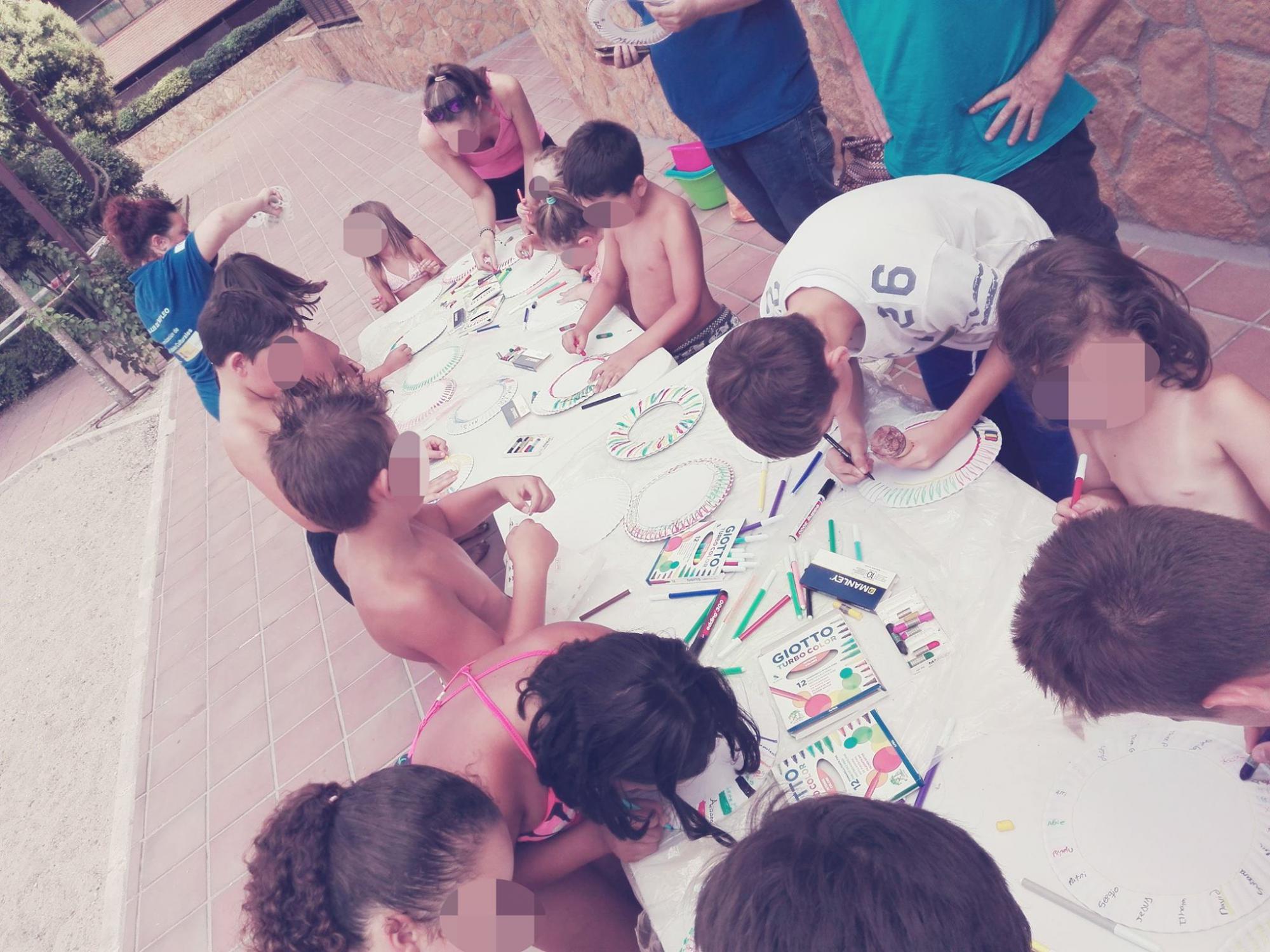 El taller de fomento de la lectura comienza con una breve sesión de cuentos ‘refrescantes’ cuya temática gira en torno al verano, la playa o el agua. Tras la función, que los niños siguen fascinados y con detenimiento mientras están sentados en el césped, llega el momento de los juegos con globos de agua. Son pruebas de destreza, algunas de ellas por parejas, tan divertidas como empapadas durante las cuales el calor se mitiga con pistolas de agua. “Lo mejor de todo es que nadie echa de menos el chapuzón mientras la bibliopiscina está en la urbanización”, comenta Perojo. Ante de emprender el regreso, se lleva a cabo una sencilla manualidad que consiste en la personalización y realización de un frisbiee o platillo volador con ayuda de dos platos de cartón que los niños decoran con rotuladores, ceras y stickers.