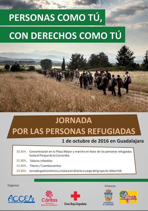 El próximo sábado día 1 de octubre, Accem, Cáritas y Cruz Roja, dentro del Programa “Personas como Tú, con Derechos como Tú”, financiado por el Ayuntamiento de Guadalajara y la Coordinadora de ONGD´s, van a desarrollar en el centro de Guadalajara múltiples actividades dirigidas a toda la población para visibilizar la situación de las Personas Refugiadas,