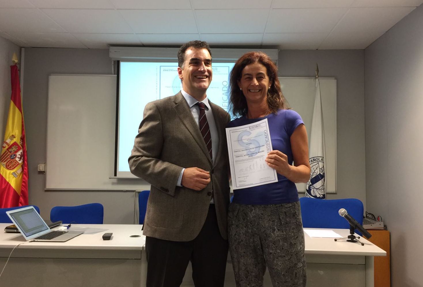 La doctora Lourdes Muñoz Corsini recogió el certificado de manos del presidente del Sistema Español de Notificación en Seguridad de Anestesia y Reanimación (Sensar), Daniel Arnal, en un acto que contó con la participación de representantes de hospitales de toda España.