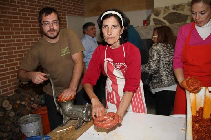 Lo primero fue despiezar el cerdo; después, picar su carne. Los agalloneros usaron cuchillos y hachas en la primera labor, que usaron sólo quienes saben manejarlos con la precisión y seguridad debida, mientras que para la segundo, los tamajoneros han servido de una de aquellas viejas máquinas ELMA, “de manivela y motor de músculo”, puntualizaba Eugenio Esteban, que se conservan una en cada casa. Aliñar el picadillo, tiene su misterio, y una receta por vecino de Tamajón, porque ya solo para la adecuada combinación de tocino y magro, y que el resultado no sea ni grasiento, ni seco, hay opiniones para todos los gustos. El frío de Tamajón es el ideal para curar los chorizos, que ayer quedaban colgados en unas estanterías preparadas al efecto, al igual que antes lo hacían en varas de madera, generalmente de nogal, sobre la lumbre. El calor y el humo, combinado con el frío del lugar, les da el punto de curación y de sabor típicos. Para meterlo en olla, no hacía falta secar mucho el embutido; para comer crudo, en rama, a gusto del consumidor. En este caso, se van a preparar de las dos maneras, para ser degustados, probablemente, en el carnaval próximo.