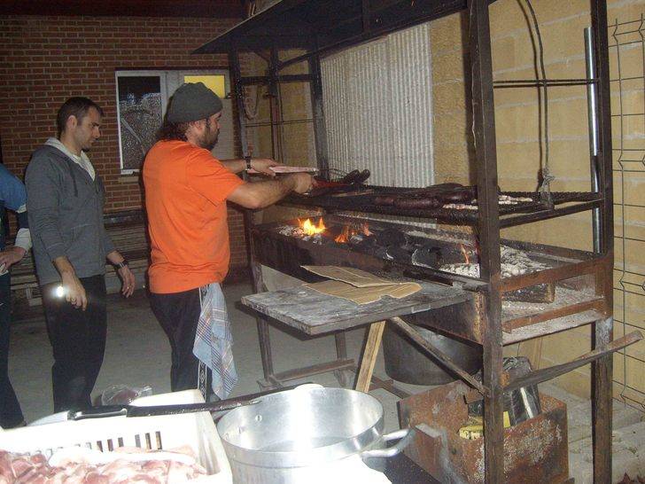 Para reponer fuerzas, los participantes cenaron somarros, panceta, torreznos y morcilla, que acompañaron con un vino manchego muy rico. El viernes, quedó la carne en reposo, para que luego, el sábado, día 10 de diciembre, por la mañana, y después de probar unas gachas hechas con harina de almorta y unas migas aderezadas con pimentón extremeño “que quitaban el sentido”, seguía Esteban, se embutieran las longanizas, en esta ocasión y por no haberse matado el cerdo, en tripa de vaca. EMBUTIENDO EL CHORIZO