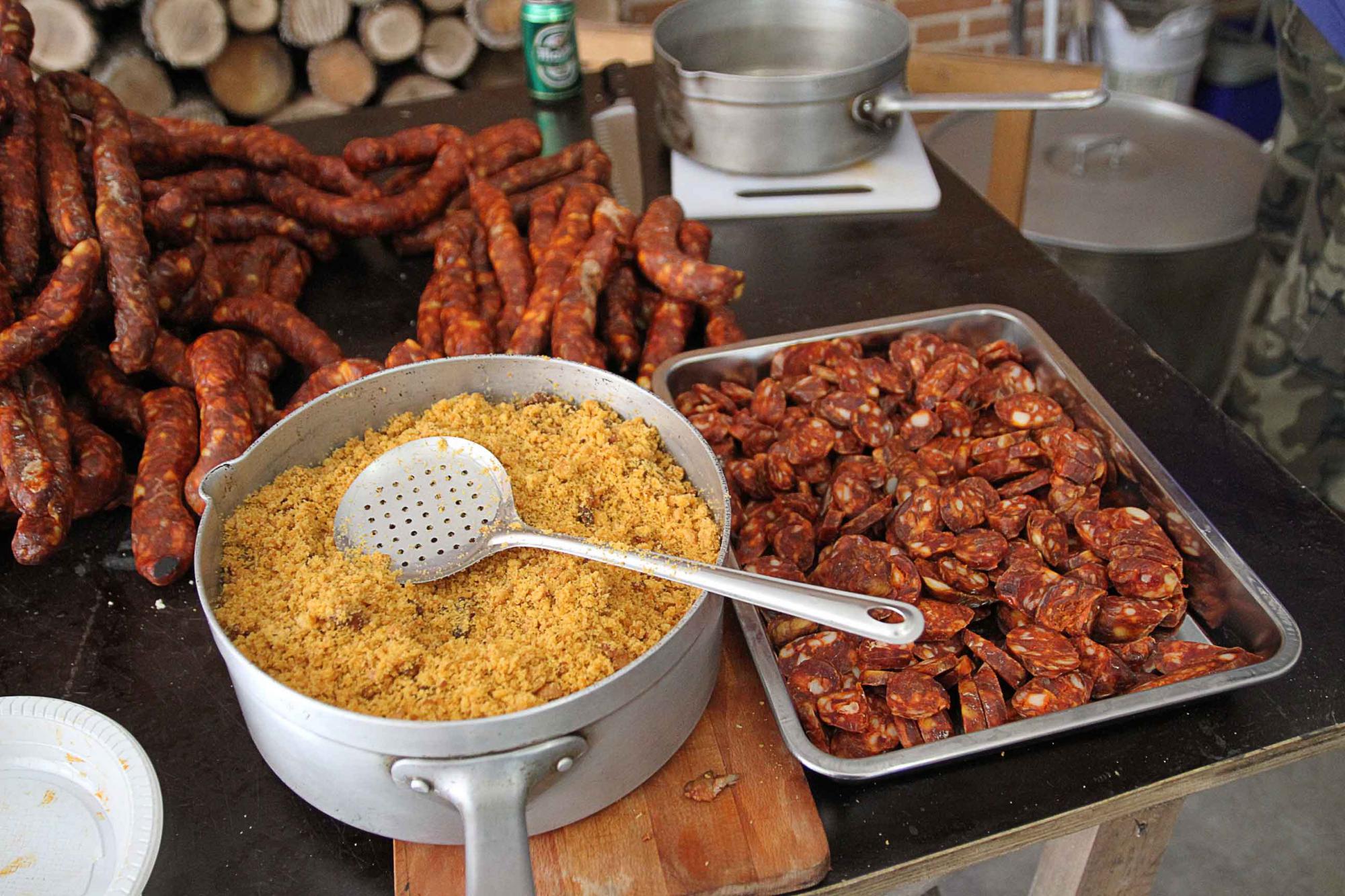 Desde por la mañana pronto, los cocineros, entre los que se contaba el propio alcalde de Tamajón, Eugenio Esteban, se afanaban para completar el menú, basado primordialmente en los productos de la matanza, con unas migas y unas gachas. Y, si el ingrediente principal del embutido es el secreto de la abuela, el de las migas es “el cariño con el que las hacemos”, decía el regidor mientras les daba vueltas.