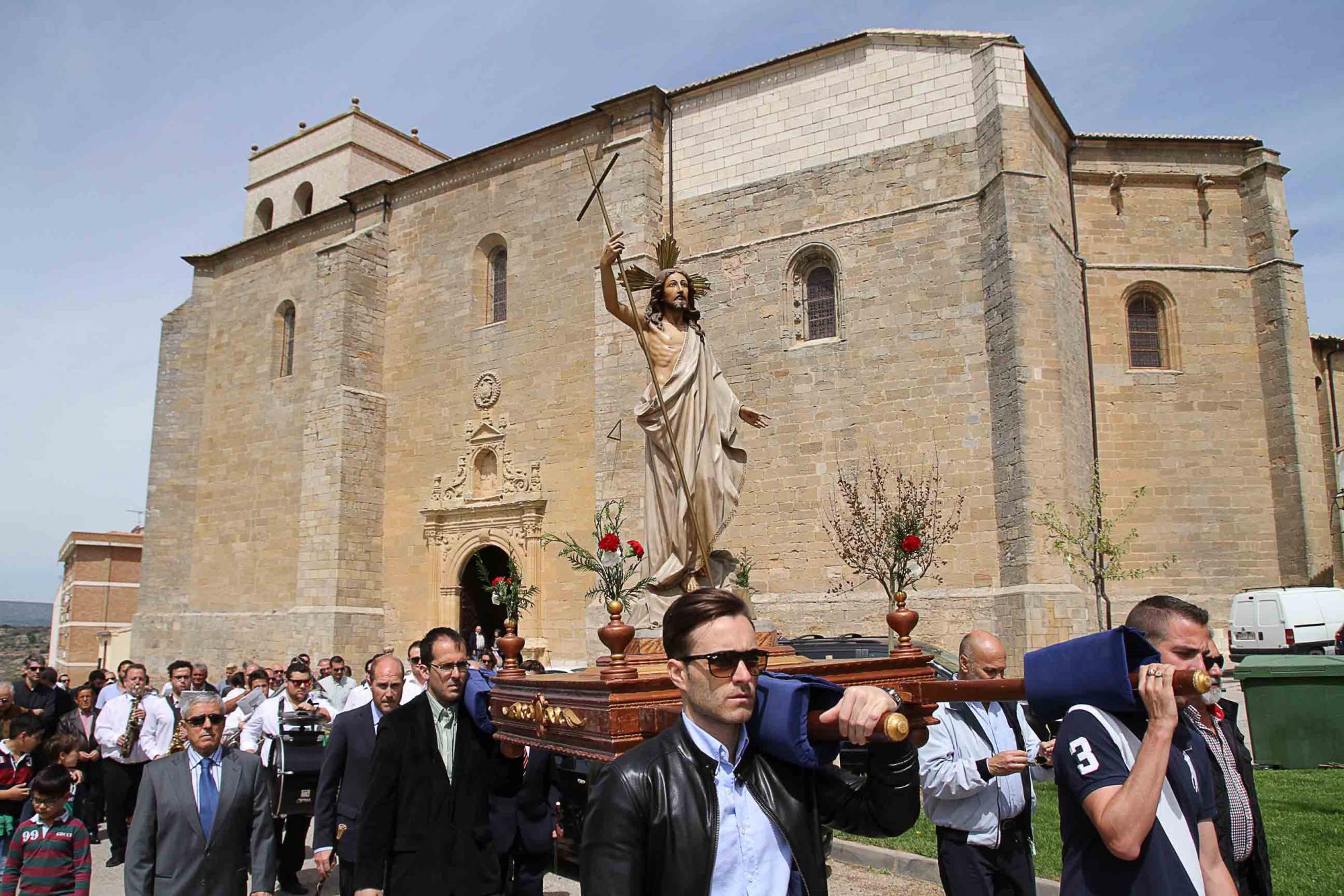 A partir de las 13:00 horas, nada más comenzar el oficio religioso que dirigió el párroco local, Javier Lucía, los hombres, y la corporación municipal, salieron de la Iglesia por la Puerta del Sol, llevando a hombros la imagen de Jesús Resucitado. Las mujeres y el propio párroco lo hicieron por la Norte, con la con la talla de la Virgen de la Soledad, inicialmente vestida de duelo.