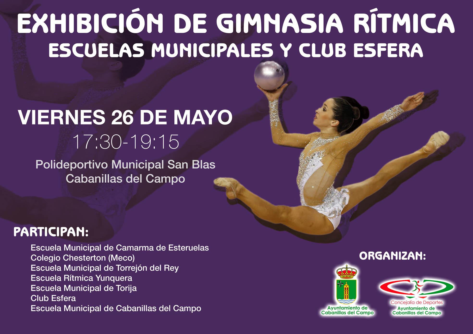 Para el viernes 26 está programada la tradicional exhibición anual que realizan el Club Esfera de Cabanillas y las Escuelas Municipales de este deporte. Se celebrará desde las 17:30 a las 19:15 horas con la participación de clubes y escuelas cercanas, como la Escuela Municipal de Camarma de Esteruelas, el Colegio Chesterton de Meco, la Escuela Municipal de Torrejón del Rey, Escuela Rítmica Yunquera, Escuela Municipal de Torija, y las dos entidades anfitrionas: Club Esfera y Escuela Municipal de Cabanillas.