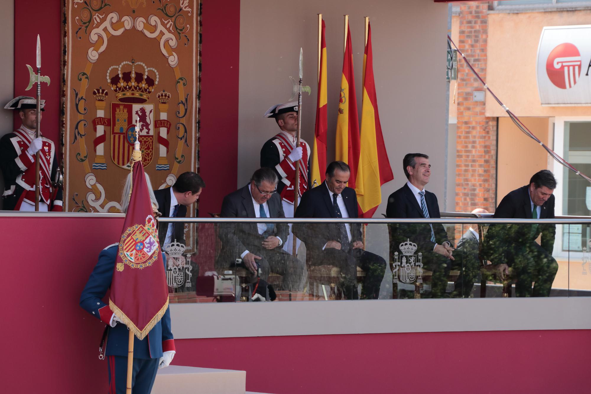 La ministra de Defensa, María Dolores de Cospedal, y la nueva cúpula militar han asistido por primera vez a este acto que se celebra fuera de Madrid tras cuatro años consecutivos y que ha retomado el espectáculo del desfile aéreo, con 63 aviones y helicópteros, entre ellos el avión de transporte A400M, y terrestre, con 160 vehículos, incluidos carros de combate Leopard y vehículos blindados Pizarro.