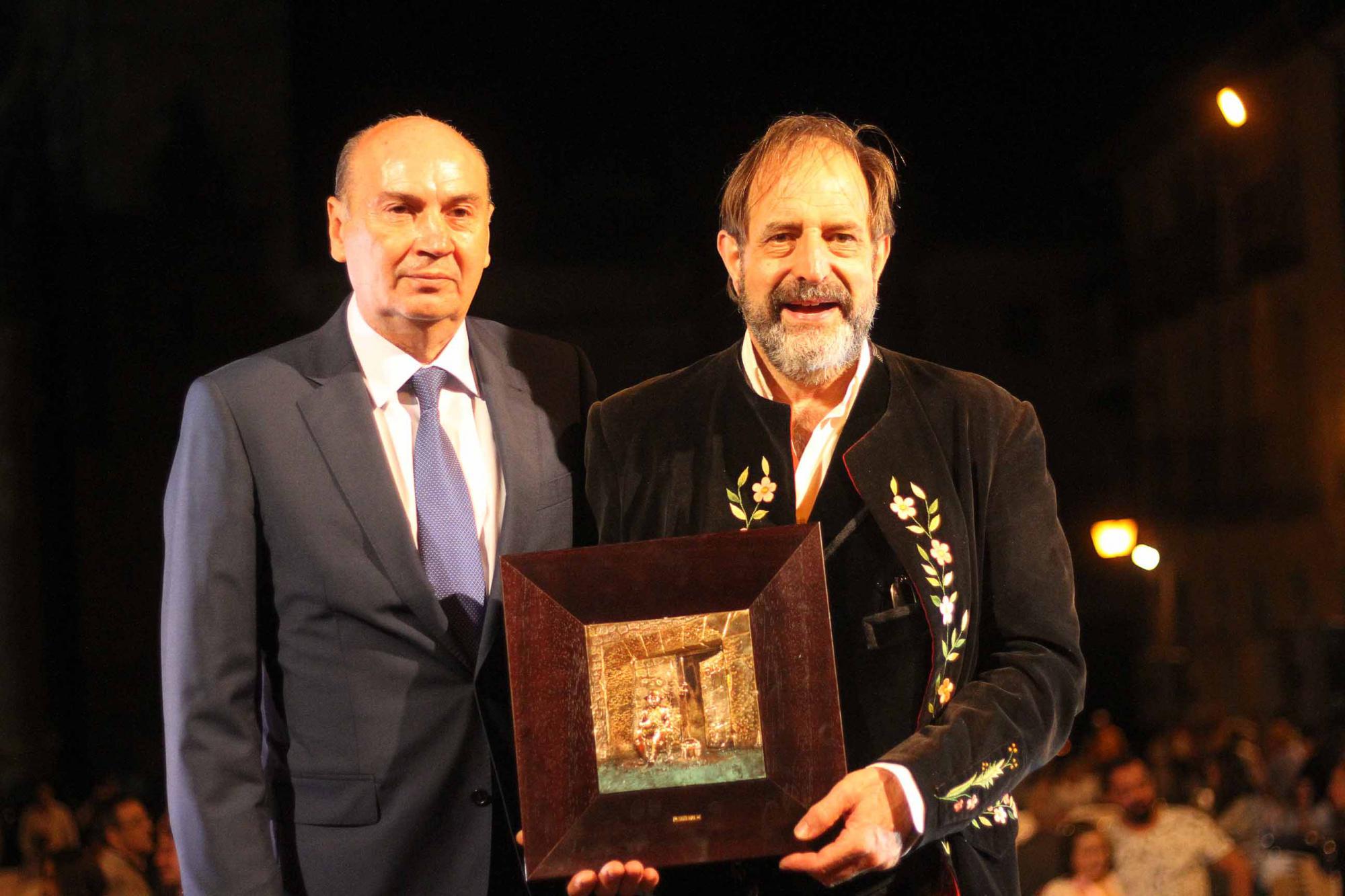 Poco a poco, el pregonero se vino arriba, dejando sentencias sobre el estrado como que “la familia, los oficios antiguos, las fiestas y las aficiones son igual a la felicidad”. Blasco se acordó también de las madres y de las mujeres en general, “que nos han traído a la fiesta de la vida”, reivindicando en varios momentos de su discurso la igualdad de género y censurando vehementemente la violencia machista. Naturalmente, y como no podía ser de otra manera, interpretó dos piezas, con flauta y dulzaina, respectivamente, una de Bob Dylan, 'Los tiempos van cambiando', y la muy popular en la ciudad, 'La ovejita lucera', en la que le acompañó como redoblante el joven Alberto Sopeña. VER ACTUACIÓN CON ALBERTO Y EL FINAL DEL PREGÓN. Blasco recibió un hermoso cuadro del cincelador Mariano Canfrán como distinción por haber sido pregonero de las fiestas de San Roque 2017.