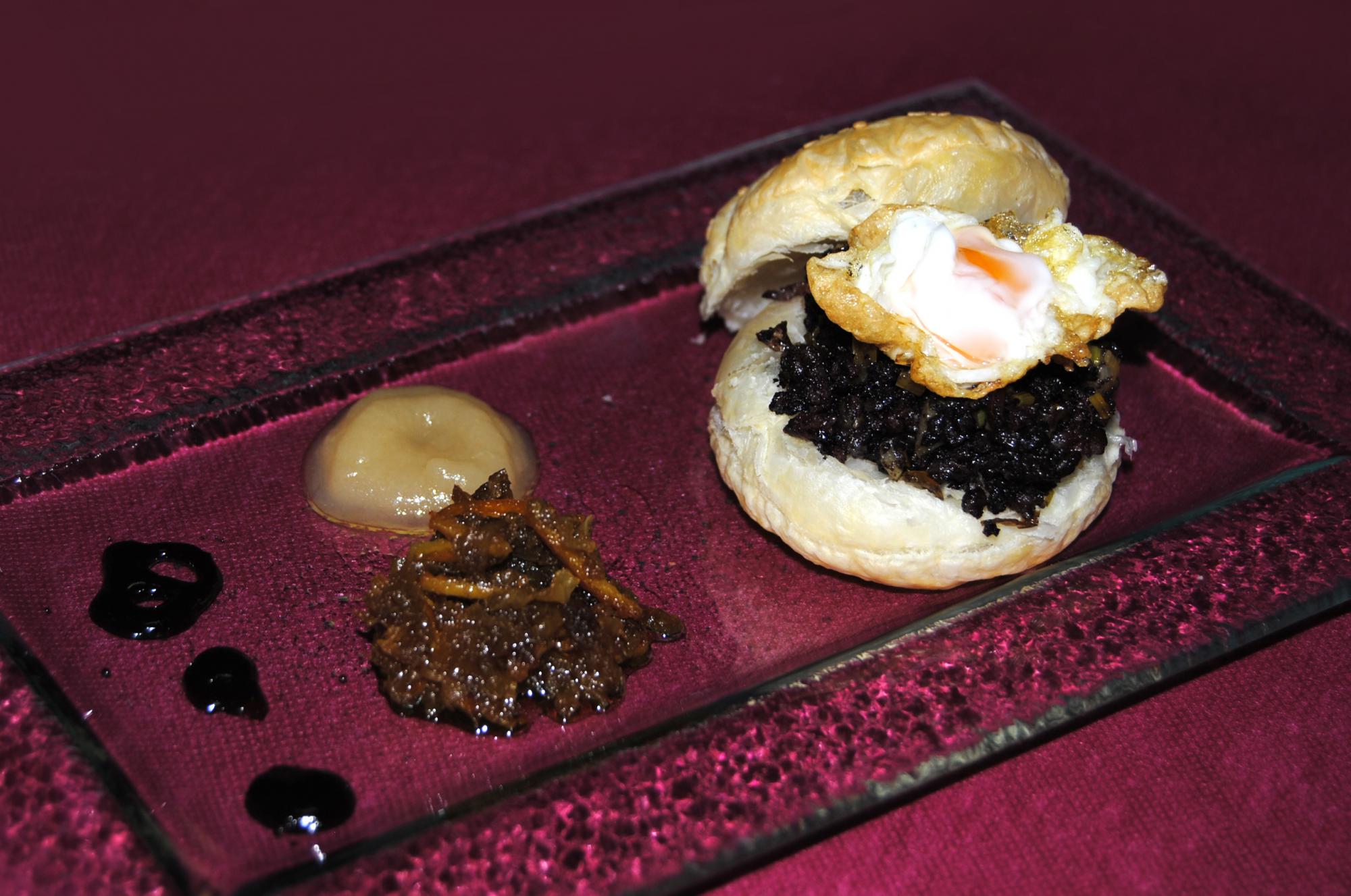 En el mismo entorno, en la calle comercial por antonomasia de Sigüenza, que es la de Cardenal Mendoza, está la Cafetería Paris. Carmen Rello, cocinera habitual del concurso que acumula tantas participaciones como ediciones tiene, ha preparado este año una 'Hamburguesa del Medievo'. Sobre tapas de hojaldre, la chef ha creado un suculento relleno de morcilla, puerro, manzana y un huevo de codorniz, al que añade compota de manzana, frutos rojos y cebolla caramelizada con un poquito de naranja, que aporta elegancia al sabor. Sus tapas medievales, como su simpatía y buen hacer culinario, son bien conocidas en la ciudad, y desde luego un clásico de la Ruta.