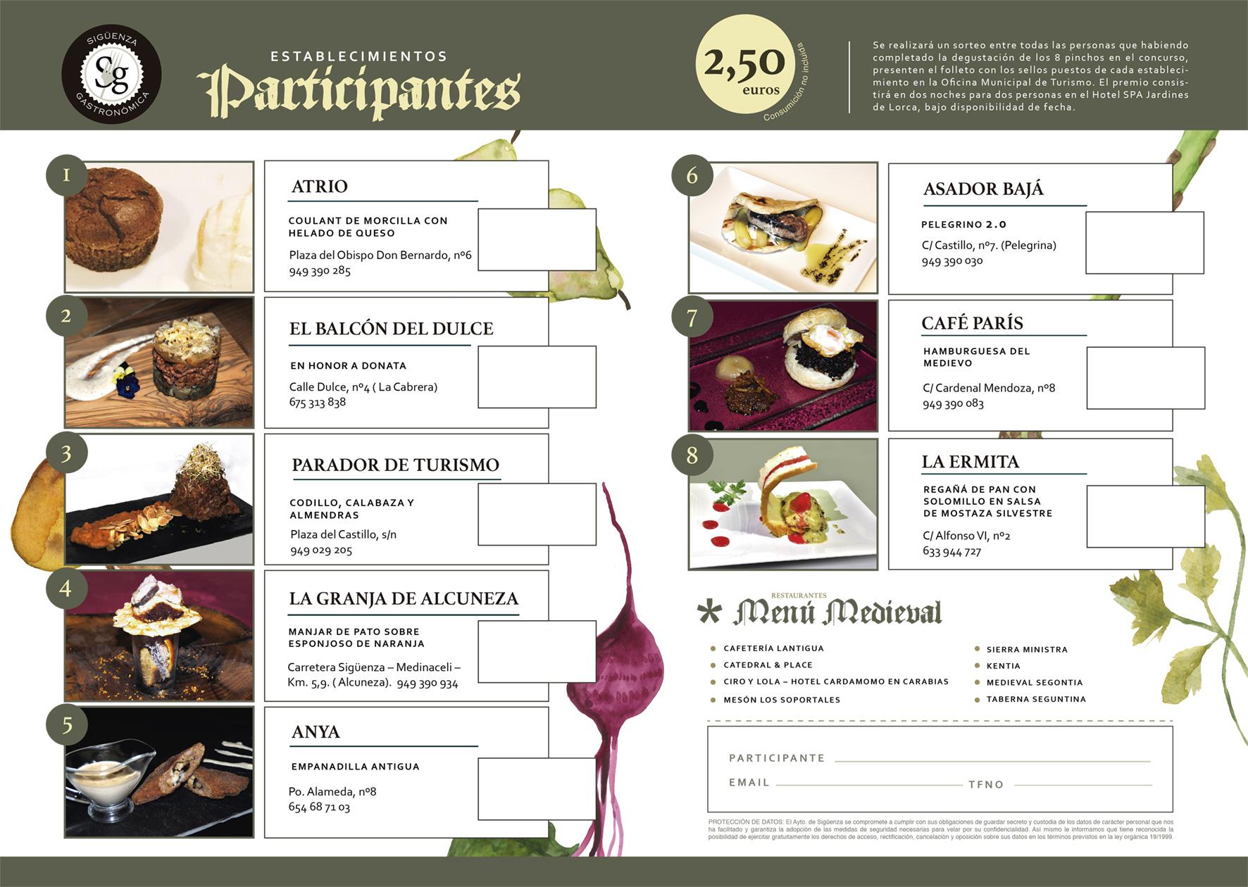 En 2018 son ocho los bares y restaurantes que competirán en buena lid, como damas y caballeros del pincho medieval, por alzarse con el triunfo en el concurso (Presentación el viernes 13 de abril, 19:30 horas en el Parador de Turismo y entrega de premios el sábado, 14 de abril, 18:00 horas, Salón de Plenos del Ayuntamiento). Después, sus delicias culinarias se alinearán para componer una atractiva ruta del pincho medieval en Sigüenza, que este año tiene parada en tres de las pedanías del municipio. Fuera del concurso, pero dentro del itinerario gastronómico, están también otros ocho locales que proponen un menú medieval completo. Son Catedral Place, Kentia, Cafetería Lantigua, Mesón los Soportales, Sierra Ministra, Medieval Segontia y Taberna Seguntina.