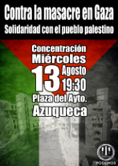 Con esta convocatoria fijada el próximo miércoles 13 de agosto a las 19:30 en la plaza del ayuntamiento se pretende movilizar a la ciudadanía, tanto azudense como de toda la provincia y alrededores, en pos de mostrar un total rechazo al genocidio perpetrado por el gobierno sionista del estado de Israel.