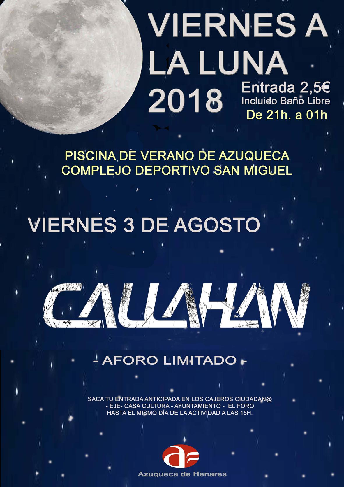 El grupo azudense 'Callahan' ofrece el 3 de agosto un concierto en la última sesión del programa 'Viernes a la luna', que impulsa el Ayuntamiento de Azuqueca de Henares. La piscina de verano, ubicada en el complejo San Miguel, acoge esta cita musical a partir de las 21 horas y hasta la una de la madrugada.