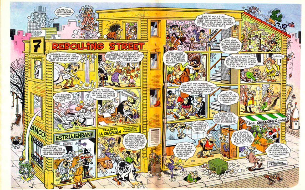 Un edificio que podría ser como la casa del 13 rúe del Percebe, la famosa historieta de Ibáñez que forma parte del título de la exposición, "¡Beatos, Mecachis y Percebes!" a su vez nombre de tres personajes inventados que podrían "salir de un tebeo de Bruguera y que permiten hablar de la historia de la humanidad a través de este formato a veces un tanto denostado".
