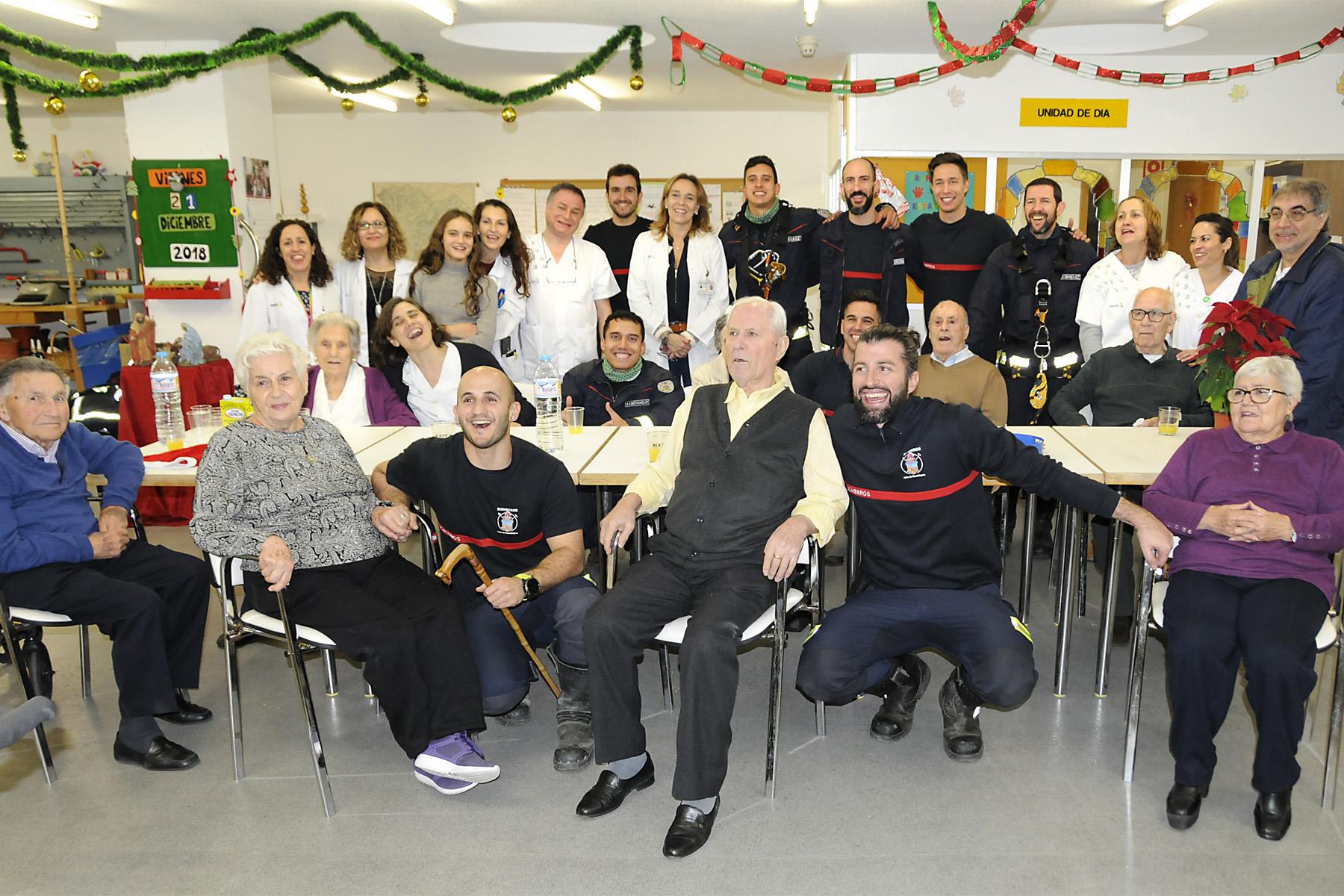 Este año, dos de estos bomberos han accedido al edificio descolgándose desde la azotea del edificio conocido como materno-infantil, situado a la entrada del Hospital, y entrando por una de las ventanas de la planta de hospitalización de Geriatría. Allí, un grupo de bomberos ha recorrido las distintas habitaciones para saludar, felicitar las fiestas y pasar un tiempo con los mayores ingresados.
