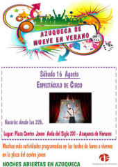 La plaza del Centro Joven acoge este sábado 16 de agosto, a partir de las 22 horas, una nueva propuesta de ocio, en esta ocasión, un espectáculo de circo para todas las edades. La concejala de Juventud, Sagrario Bravo, anima a los vecinos y vecinas a sumarse a esta actividad y recuerda que la entrada es libre.