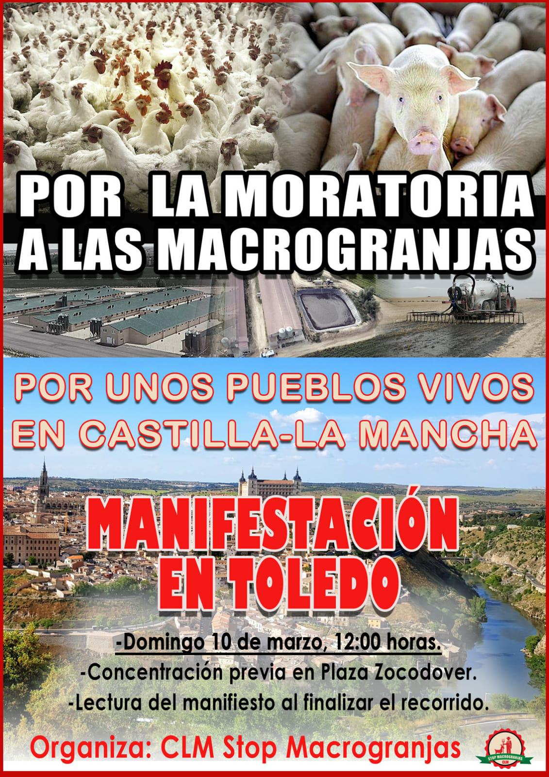 Los pueblos de Castilla-La Mancha no cesan en sus reivindicaciones por mantener sus pueblos libres de la amenaza de la ganadería industrial intensiva, por eso el domingo 10 de marzo a las 12.00 de la mañana se concentrarán en la plaza Zocodover de la capital toledana, desde allí marcharán pasando por las calles Comercio, Hombre de Palo, Nuncio Viejo, Cardenal Lorenzana, Plaza San Vicente, calle La Plata, Toledo de Ohio, y vuelta por la Calle Comercio para regresar a la Plaza Zocodover donde se leerá un manifiesto.