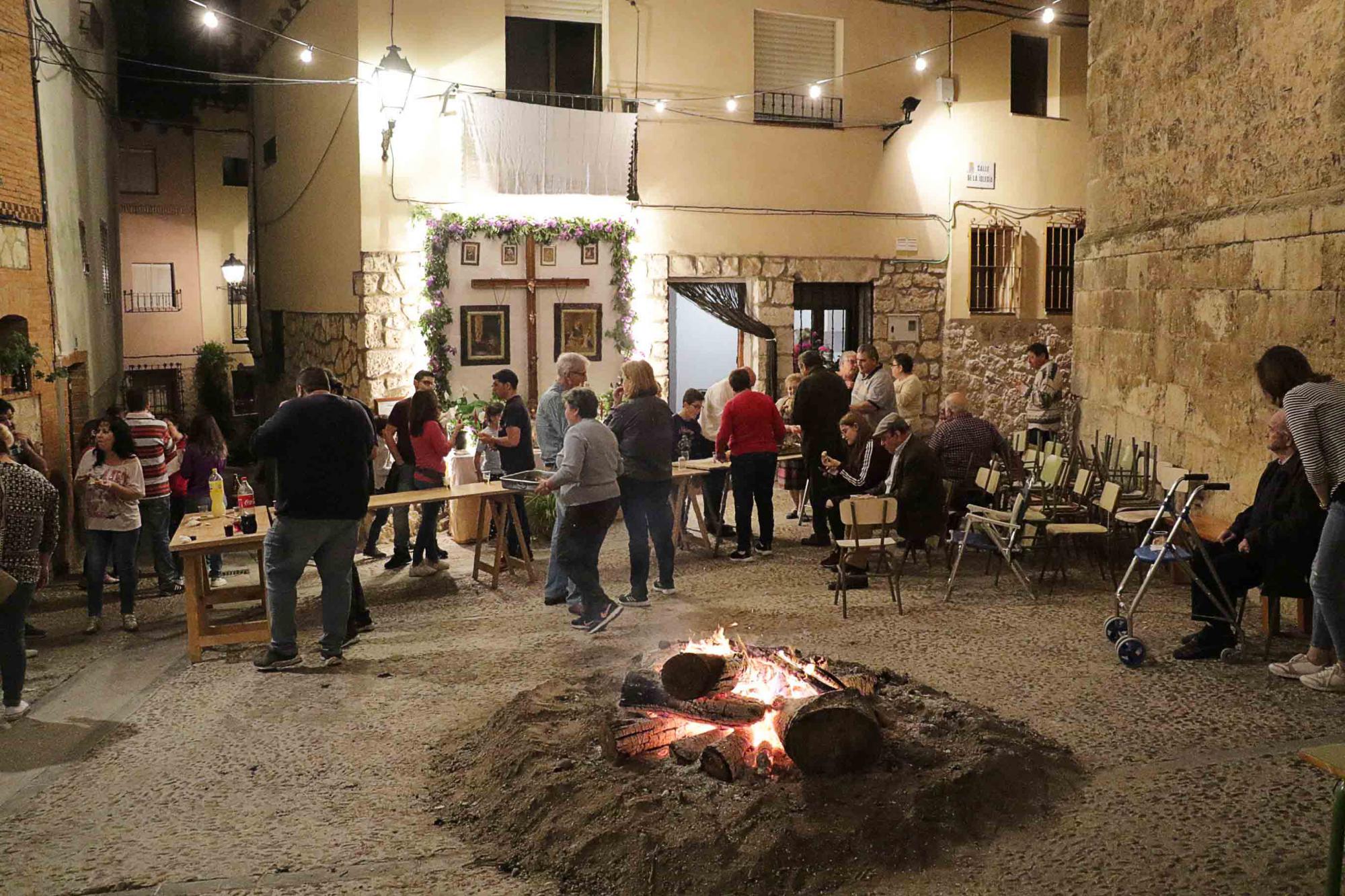 En la calle del Viento, que es la que se visita a continuación, destacaba la armonía y la alegría de los presentes. Ellos si se juntaron, ya anoche, para cenar, a la espalda de La Colegiata, como contaba Emilia Jimenez. En la lumbre, los vecinos asaban panceta morcilla y chorizos, regados con limonada, vino y cerveza. Hoy, están comiendo paella. “La Cruz la decoramos con flores, con plantas, una colcha mía, de novia, y unas sábanas. Los cuadros son de otra vecina. Hacemos rosquillas, de las de Pastrana y mantecados, que luego repartimos entre los vecinos y entre la gente que viene a cantarle a la Cruz. Lo pasamos en grande”, dice.