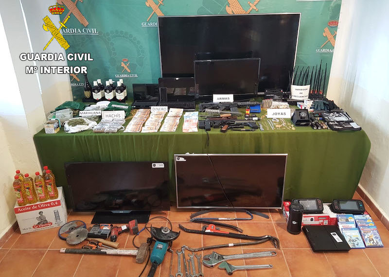 En total, se han realizado siete registros domiciliarios, de los cuales cinco han tenido lugar en San Martín de la Vega, uno en Carranque y otro en la localidad de El Viso de San Juan, también en la provincia de Toledo. Entre los efectos intervenidos destacan más de 13.000 euros, 1.234 gramos de hachís, 696 gramos de marihuana, tres pistolas simuladas, varias armas de electrochoque taser, vestimenta para cometer los robos y dos vehículos, joyas y material electrónico.