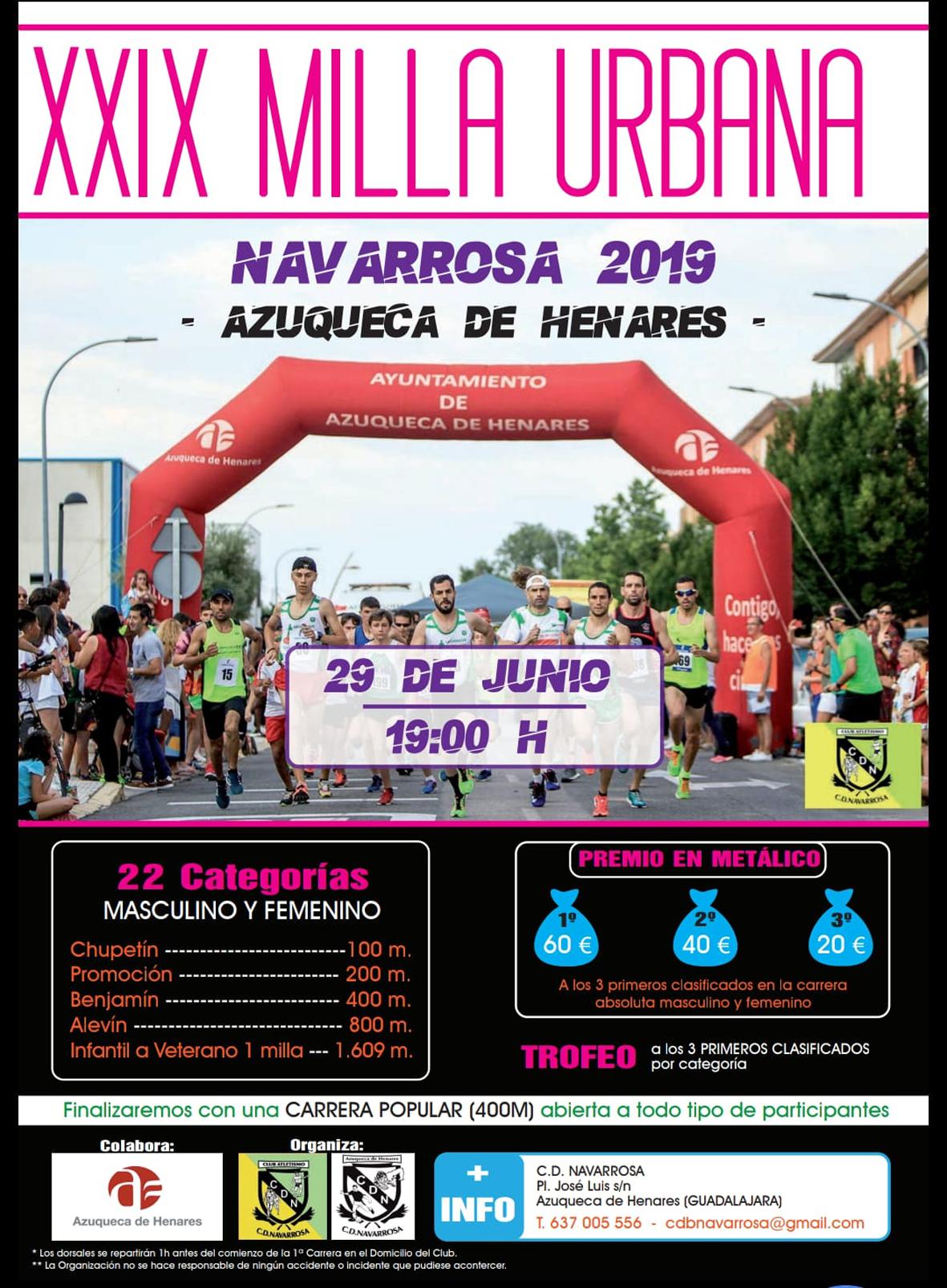 El Club Deportivo Navarrosa, con la colaboración del Ayuntamiento de Azuqueca de Henares, organiza este sábado, 29 de junio, a partir de las 19 horas, la edición número 29 de la Milla Urbana. La competición, que discurre en los alrededores de la plaza José Luis Viejo, abarca desde la categoría Chupetín a Veterano, femenino y masculino, con distancias entre los 100 y los 1.609 metros (una milla). Al finalizar la prueba, se celebra una carrera popular de 400 metros abierta a todos los participantes.