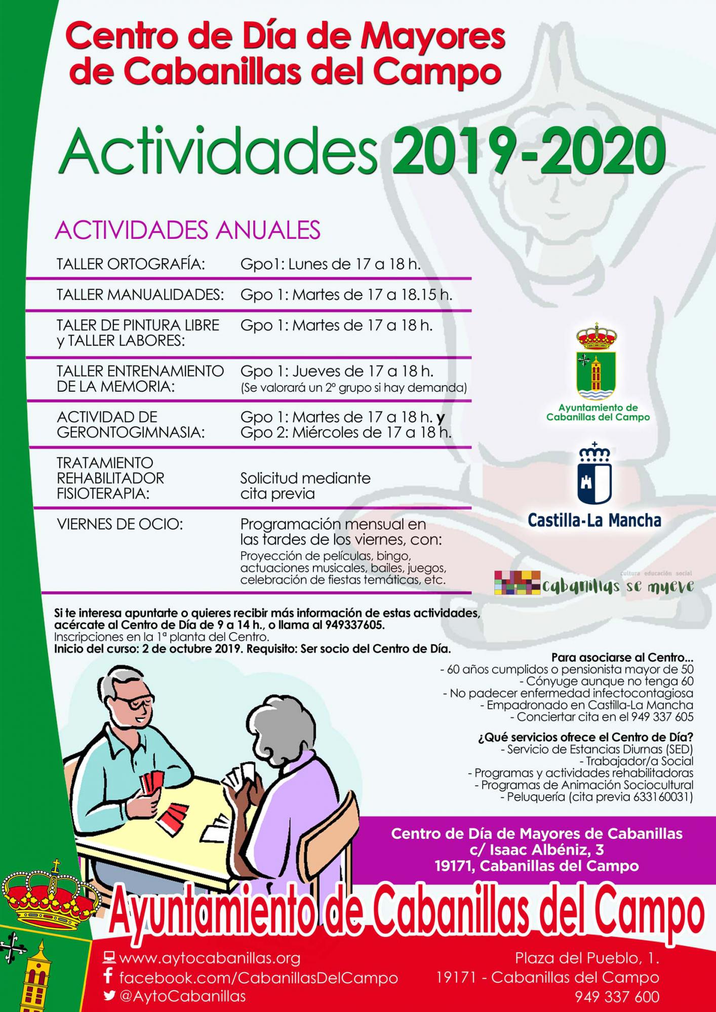 Ya está abierto el plazo de inscripción para las actividades anuales que a lo largo del nuevo curso 2019-2020 desarrollará el Centro de Día de Mayores de Cabanillas del Campo. Estas actividades están destinadas a socios y socias del centro, y comenzarán a desarrollarse el día 1 de octubre, con periodicidad semanal.