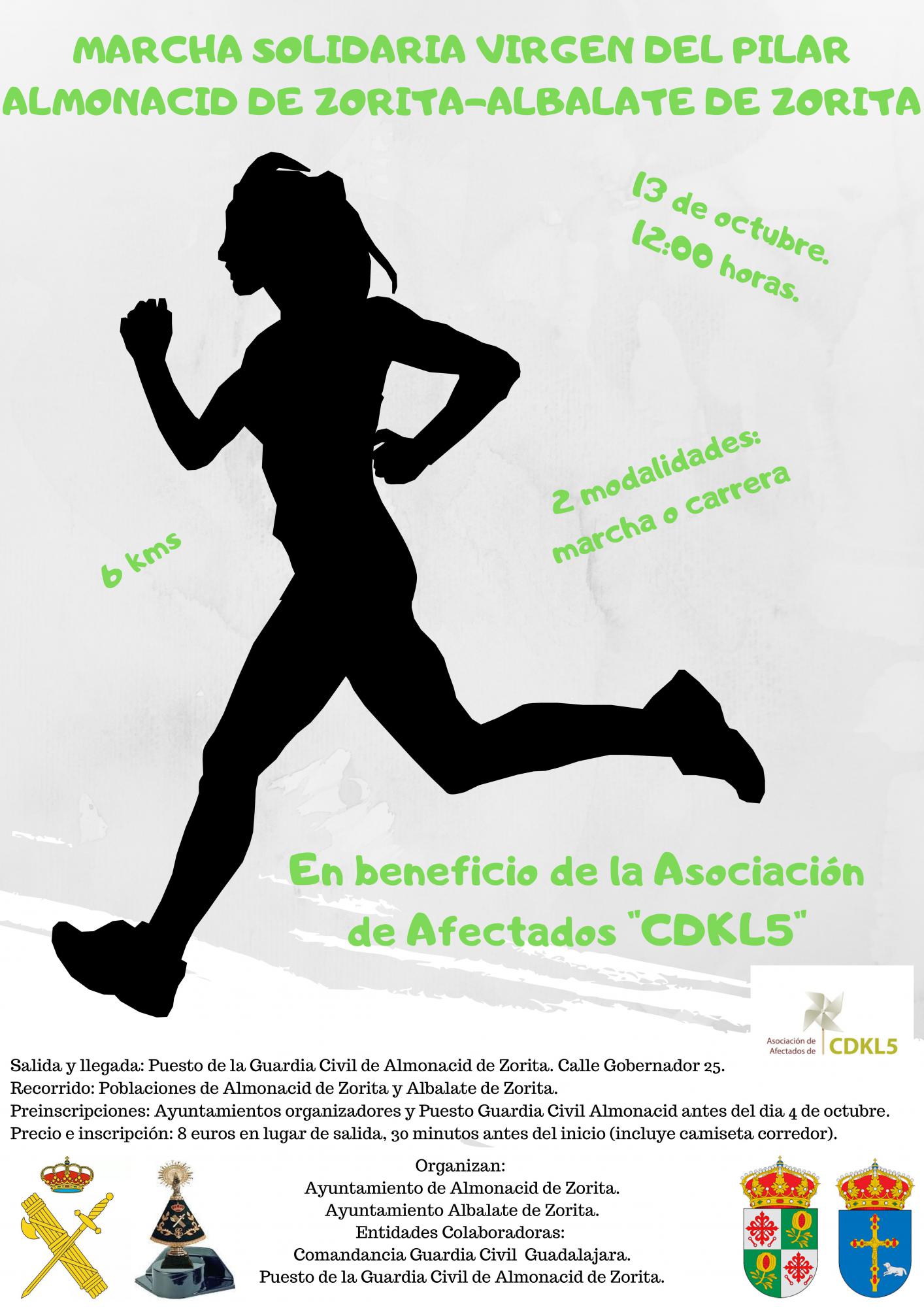 La Marcha Solidaria Virgen del Pilar, en beneficio de la Asociación de afectados por el trastorno genético “CDKL5”, está organizada por los ayuntamientos de Almonacid de Zorita y Albalate de Zorita, que pretenden sensibilizar a sus vecinos sobre la importancia de esta patología y reclamar que se destinen más fondos económicos para su investigación y tratamiento. En la carrera participan también como entidades colaboradoras la Comandancia de la Guardia Civil de Guadalajara y el Puesto de la Guardia Civil de Almonacid.
