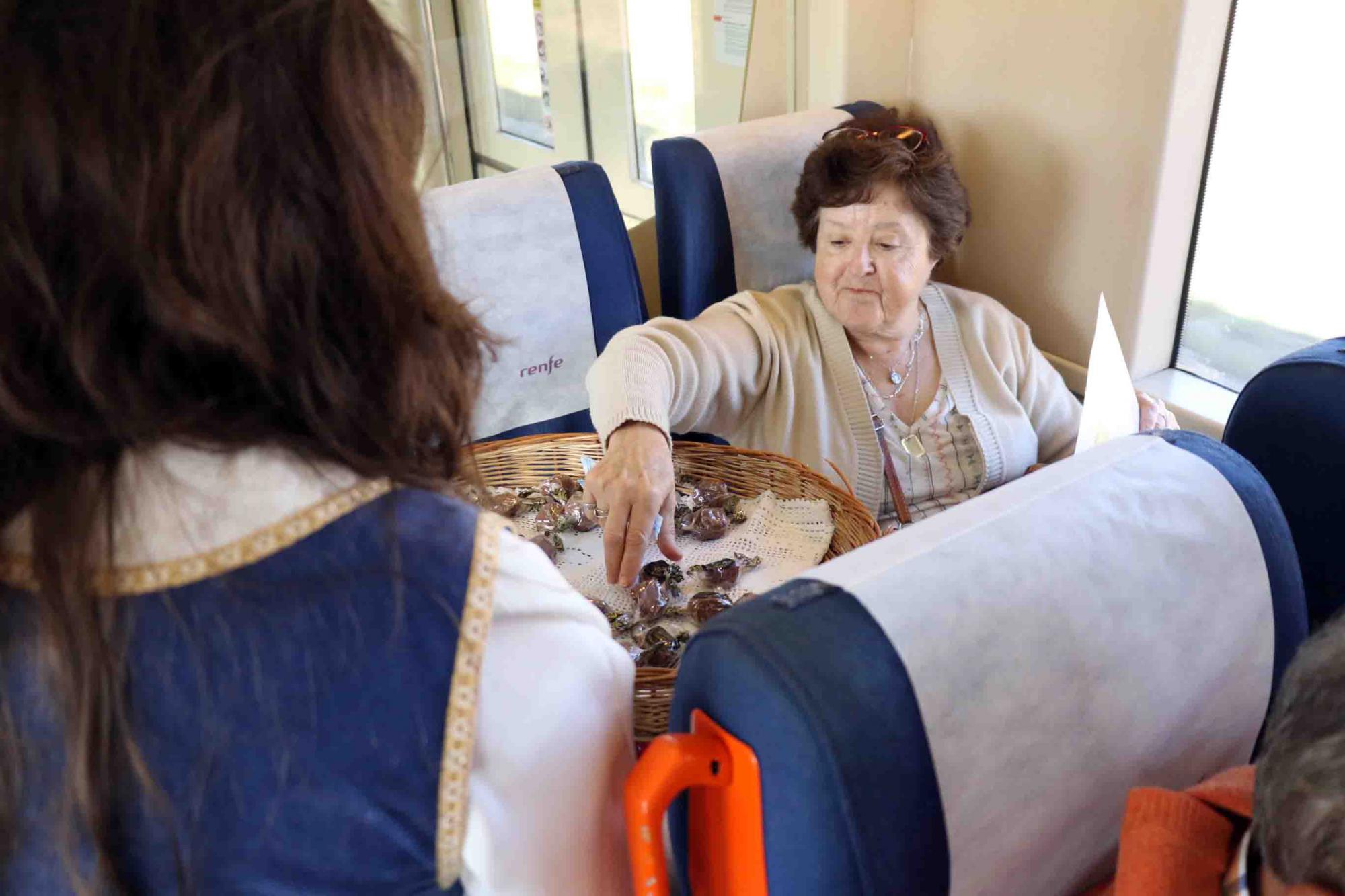 Todos ellos recibieron dulces, los doncelitos, de la Pastelería Las Delicias, y las trufas de las monjas Clarisas. Con el gusto del dulce en la boca, la sonrisa de la comedia en el rostro, y la música de la zanfona y el tambor en los oídos, quedaban divididos en tres grupos para hacer la visita guiada a la ciudad. El recorrido se iniciaba en el Parque de La Alameda e hilvanaba lugares emblemáticos como la Casa del Doncel, el castillo Parador que saludaba a los viajeros esta vez de cerca, o el patio de la Catedral, aun de aniversario. Al terminar la visita guiada, y con la Plaza Mayor jalonada de puestecitos artesanos, el patio del Ayuntamiento, la casa del pueblo, se convertía en el escenario ideal de la representación final. Allí, el personal del Tren Medieval sorteó objetos artesanos, una noche en un establecimiento hotelero de la ciudad, con viaje en tren incluido, una ruta de senderismo por el Rio Dulce, y un lote de productos Despelta. Además, con el billete del tren los viajeros obtenían descuento en la entrada para visitar Catedral y al Museo Diocesano.