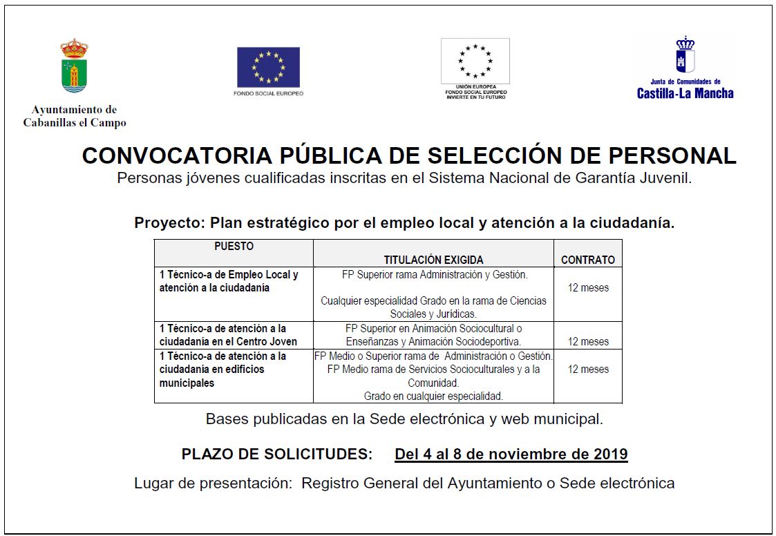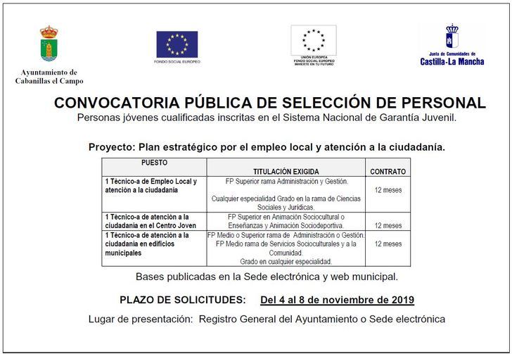 El Ayuntamiento de Cabanillas del Campo lanza una convocatoria pública de selección de personal para la contratación de tres personas jóvenes (de 18 a 30 años), cualificadas, e inscritas en el Sistema Nacional de Garantía Juvenil. Se trata de una línea de contratación de personal financiada por la Junta de Comunidades y el Fondo Social Europeo, dentro del "Plan Estratégico por el Empleo Local y la Atención Ciudadana".