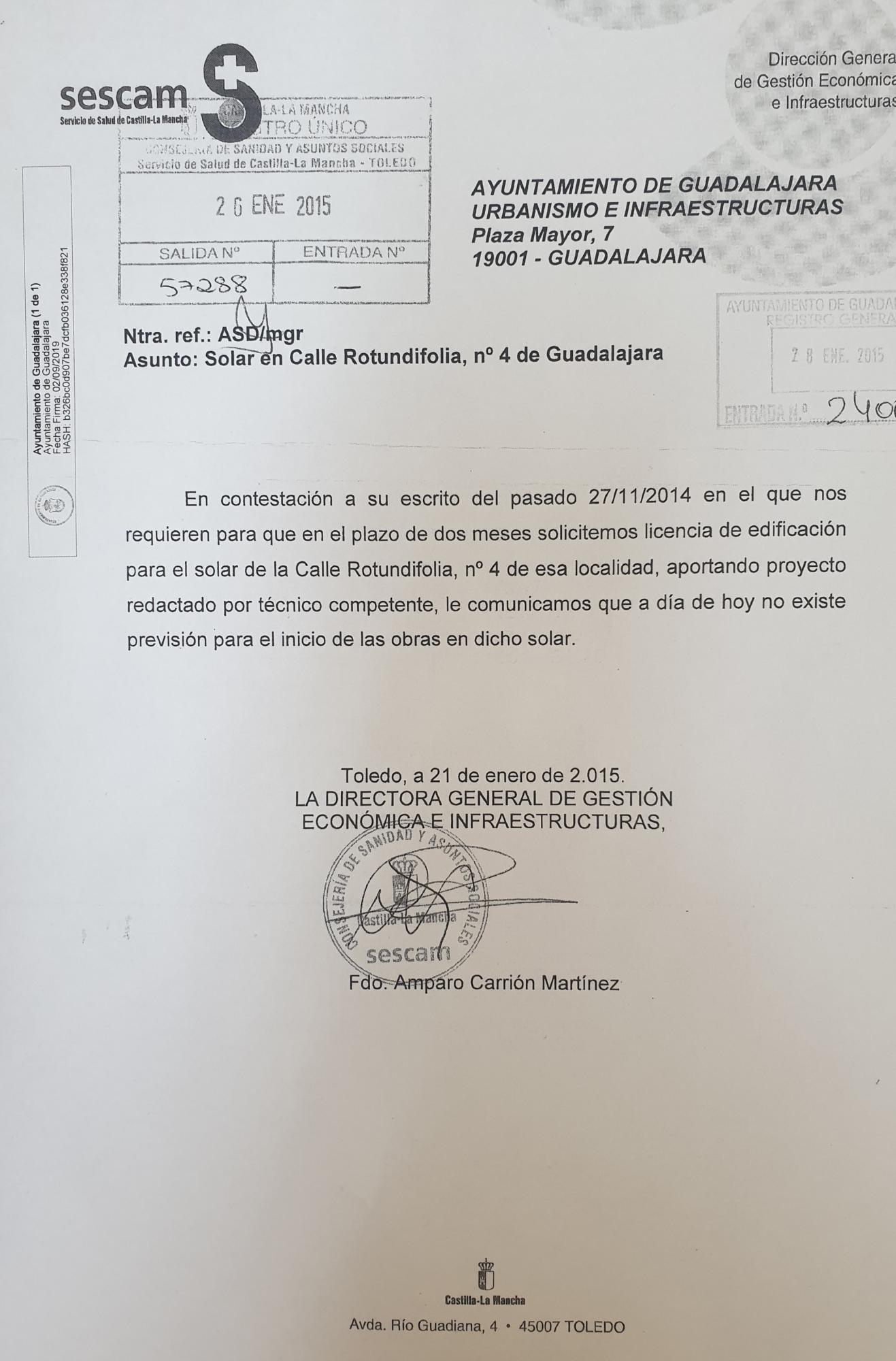No obstante, transcurridos cinco años que marca la ley para este tipo de cesiones, la parcela tuvo que revertir de nuevo al Ayuntamiento. De hecho, desde el anterior equipo de gobierno se cursó notificación con fecha de noviembre de 2014 requiriendo a la Junta que solicitara licencia de edificación en el plazo de dos meses aportando proyecto redactado por el técnico competente -se adjunta carta- ante lo que la Junta contestó en enero de 2015 que “a día de hoy “no existe previsión para el inicio de las obras en dicho solar”. “Desde mayo de 2015 hasta 2019, nadie de la Junta se interesa por esta infraestructura anunciada en 2015”, por lo que el 4 de marzo de 2016 tiene que revertir al ayuntamiento de nuevo siendo presidente García-Page.