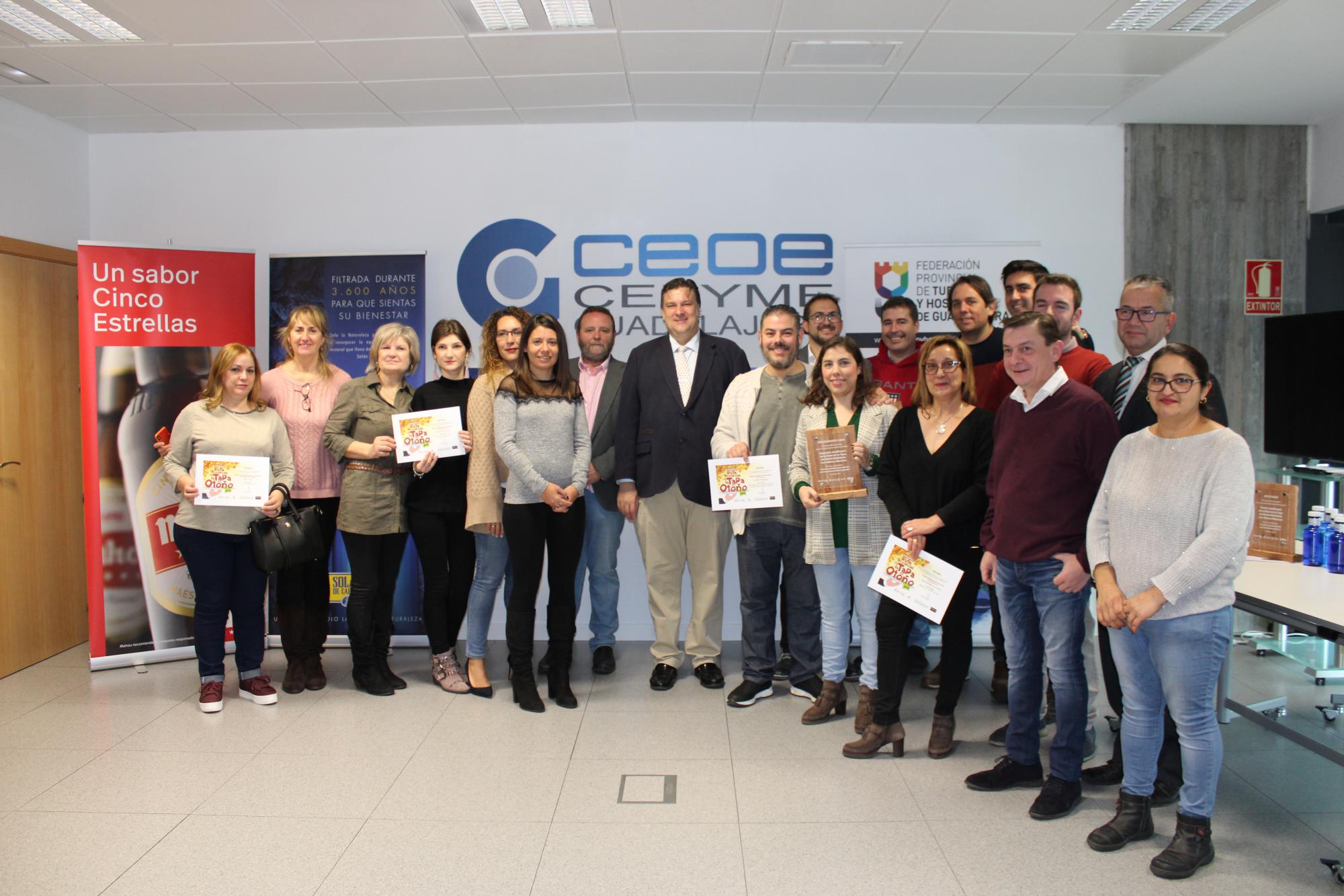 Elena Catalina, gerente de la Cervecería Relax, Mario y Cristina de Lucas, gerentes del Casino Principal y Manuela Martín, Francisco Javier Sánchez y Adriana Dumitru, gerentes y cocinera, respectivamente del Restaurante la Curva, han sido los encargados de recoger los diplomas acreditativos, que han sido entregados, el tercer premio por Juan Luis Pajares, presidente de la Federación Provincial de Turismo y Hostelería de Guadalajara, el segundo premio lo ha entregado Bárbara García, vicepresidenta de la Diputación Provincial de Guadalajara, mientras que Fernando Parlorio, concejal de Turismo y Comercio del ayuntamiento de Guadalajara, ha sido el encargado de hacer entrega del primer puesto de la ciudad de Guadalajara.