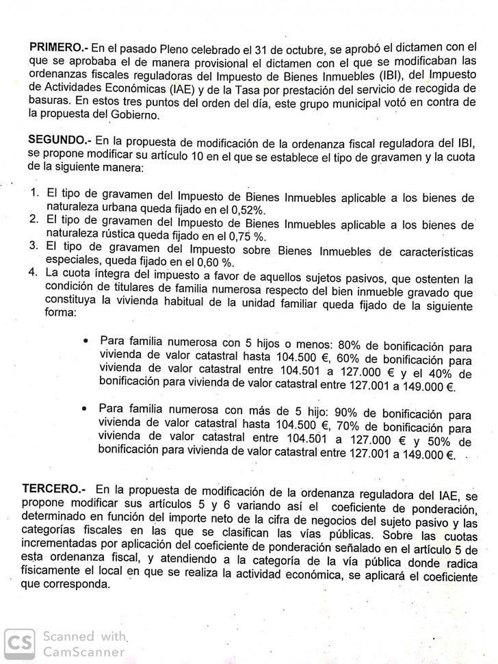 "Con ellas pretendíamos anular el acuerdo plenario de noviembre con el que el PSOE decidía sangrar a los contribuyentes. Desgraciadamente, a partir del año 2020, las vecinas y vecinos experimentarán una subida importante en sus recibos de IBI (de 0,49 a 0,52%) y de la tasa de recogida de basuras (de 36,10 a 80 € anuales). El señor Alcalde ha decidido desestimar nuestras alegaciones mediante una cacicada, conducta ésta a la que nos tiene ya acostumbrados, convocando un pleno extraordinario urgente vulnerando así los derechos que tenemos como representantes de la oposición" manifiesta la portavoz del grupo, María José Pérez Salazar.