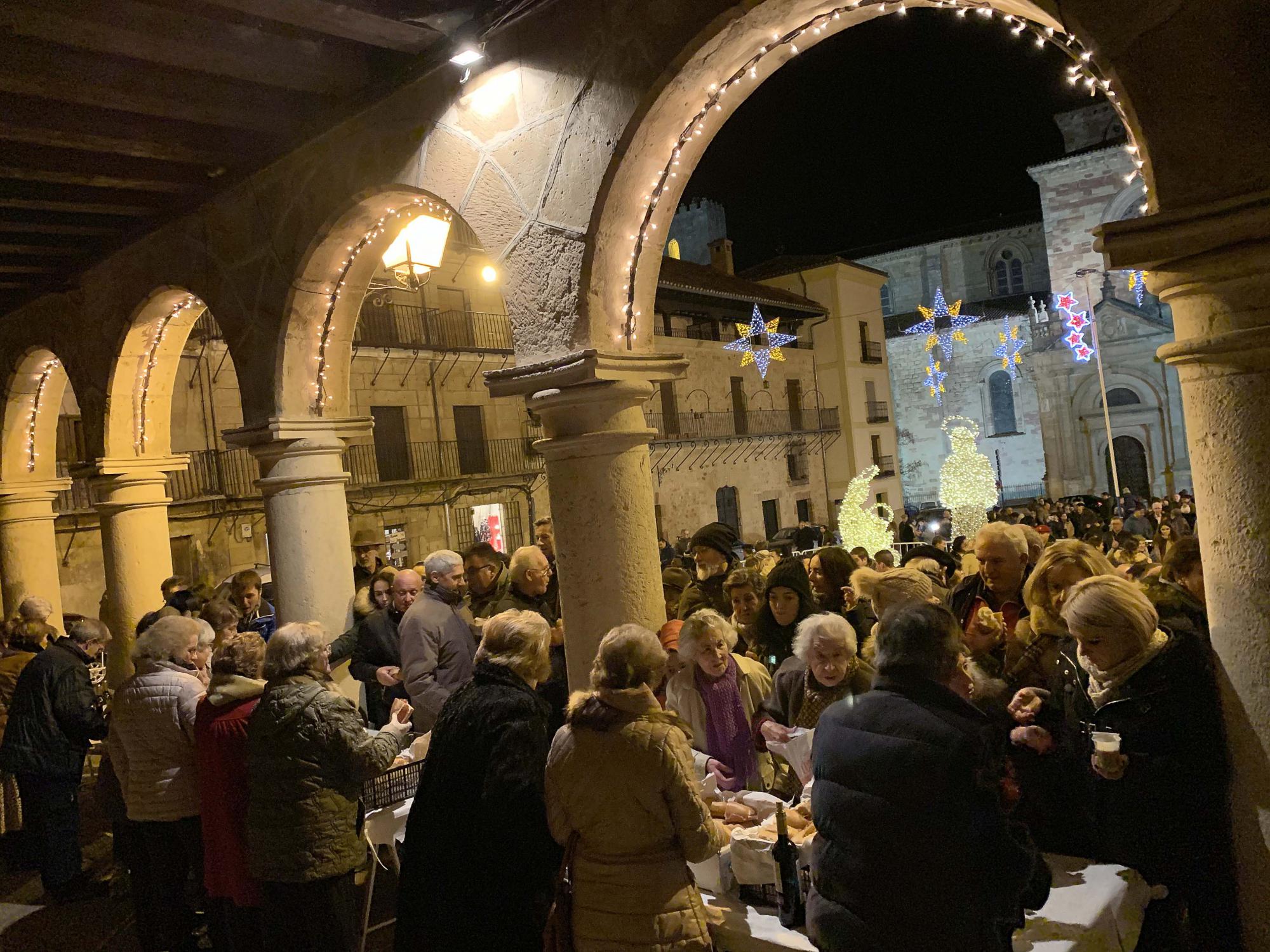 Por fin, la comitiva llegaba a la Plaza Mayor, donde los presentes pudieron combatir el frío, menos que otros años, con un caldito caliente, un vaso de vino, bocadillo de jamón y unos bollos, que ofrecían los integrantes de la Rondalla. Por supuesto, la ronda terminaba con el otro clásico de la Navidad local, como es el villancico de Las Doce Palabritas. La alcaldesa de Sigüenza, María Jesús Merino, fue una de las integrantes de la Gran Ronda de Navidad. “Si el sábado les escuchábamos en El Pósito, hoy lo hemos hecho en las calles de Sigüenza, poniendo la banda sonora a nuestras fiestas e invitando a acompañarles a toda la ciudad. Nuestra Rondalla es el espíritu de nuestra Navidad, y nos lo ha contagiado a todos”, señalaba.