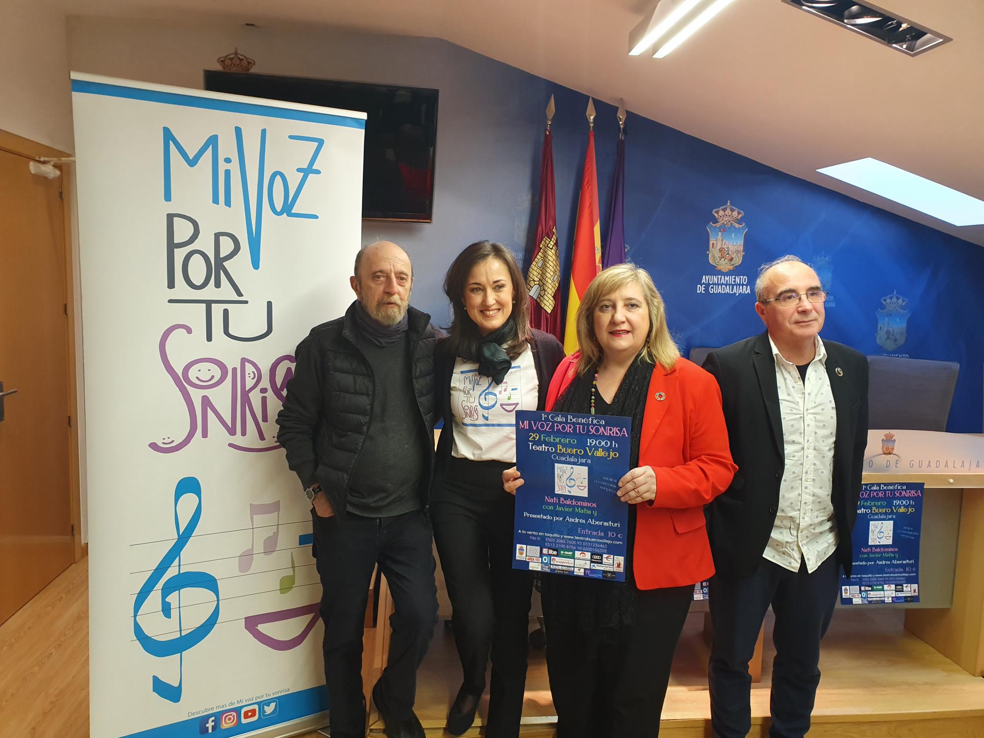 La concejala de Cultura, Riansares Serrano, a la junto a la artista Nati Baldominos, creadora de la Asociación Mi Voz por tu Sonrisa, el periodista Andrés Aberasturi, y el director de Unidos por la Paz, Manuel Fuentes, presentaron este martes los detalles de la I Gala ‘Mi Voz por tu Sonrisa’, que tendrá lugar el próximo 29 de febrero, a las 19.00 horas, en el Teatro Auditorio Buero Vallejo de Guadalajara.