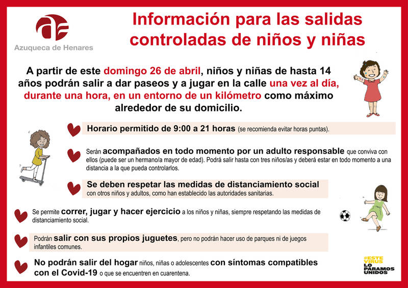 El Ayuntamiento de Azuqueca de Henares recuerda que, aunque desde el domingo las niñas y niños menores hasta 14 años podrán hacer salidas controladas a las calles, no se podrá hacer uso de los parques infantiles, que permanecerán cerrados para prevenir contagios por la COVID-19. La concejala de Educación Global, Susana Santiago, agradece "a las familias, a las madres y a los padres y, sobre todo a las niñas y niños, que hasta ahora hayan permanecido en sus casas, sin salir para protegernos a todos". "Nos sentimos muy orgullosos de la responsabilidad y la solidaridad que han demostrado durante estos días, respetando el confinamiento", añade.