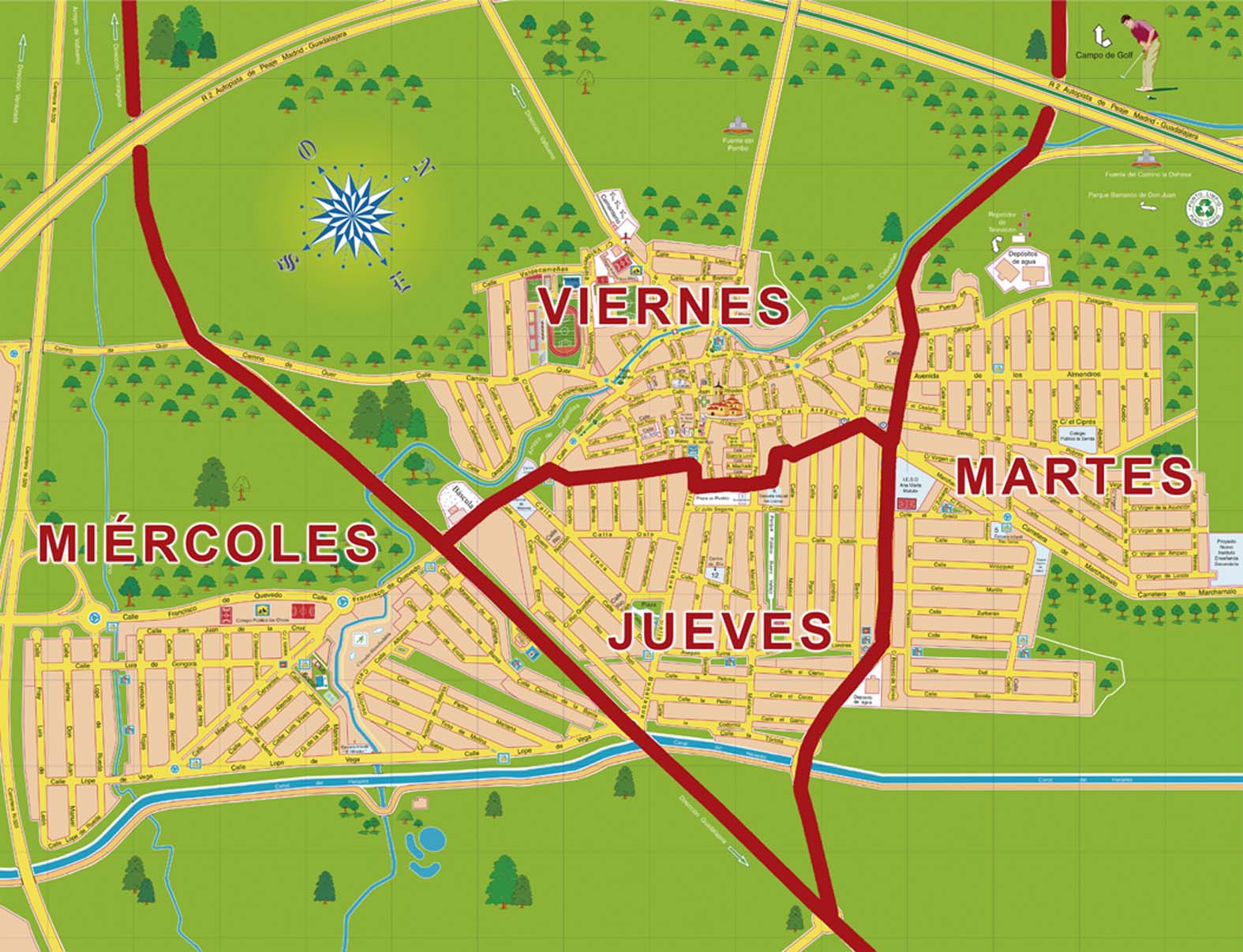 Se recuerda que este servicio se ofrece sólo de lunes a viernes, y no en festivos ni en fines de semana. Se trabaja por zonas diferenciadas en función de los días de la semana: Los lunes se recogen restos del fin de semana en todo el municipio; los martes en la zona que queda al norte de la Avenida de Guadalajara, los miércoles en la zona al sur de la carretera CM-1007 (barrios de El Mirador y El Soto); los jueves en la zona centro-este de la localidad (delimitada por las calles San Sebastián, Mónaco, Miguel Hernández y Bruselas); y los viernes en el lado opuesto, la zona centro-oeste del municipio.