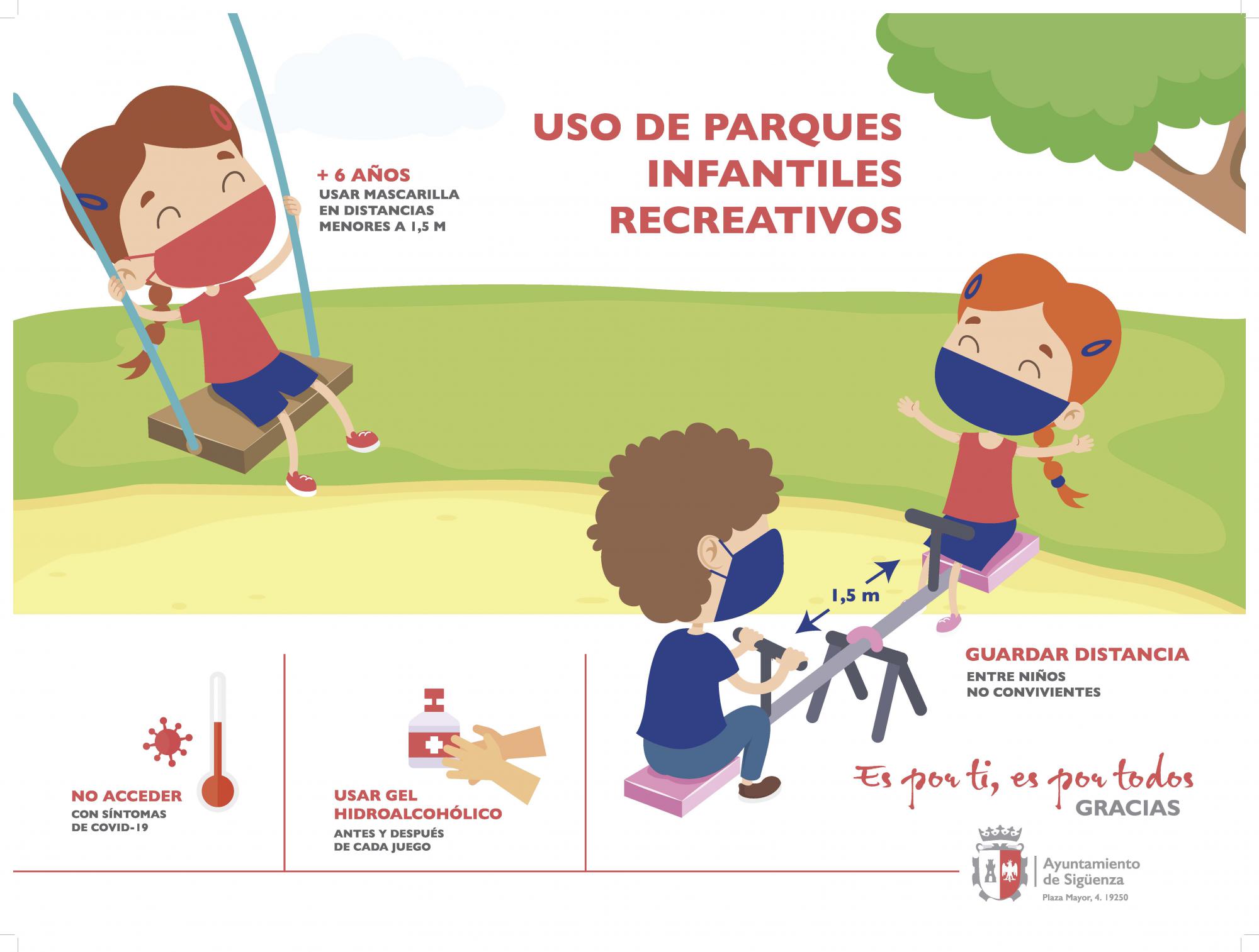 El Ayuntamiento de Sigüenza hace un llamamiento a la responsabilidad en su uso. En primer lugar, no deben acudir al parque aquellas personas que tengan síntomas de COVID-19, los niños deben usar gel hidroalcohólico antes y después de cada juego. Además, los niños y niñas que no convivan en la misma casa, deben guardar la distancia de seguridad de 1.5 metros. Por último, los niños y niñas de más de seis años, deben usar mascarilla.